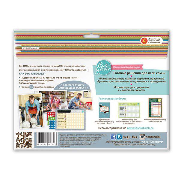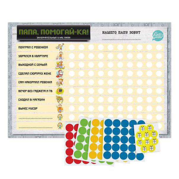 Все ПАПЫ очень хотят помочь по дому! Но не всегда знают как! Этот игровой плакат со стикерами поможет ПАПАМ разобраться:) Подарите плакат ПАПЕ, повесьте его на видное место. На каждое выполненное зада... Показать описаниение ПАПА наклеивает стикер. Каждый 10й стикер призовой. А как награждать ПАПУ решает МАМА:)