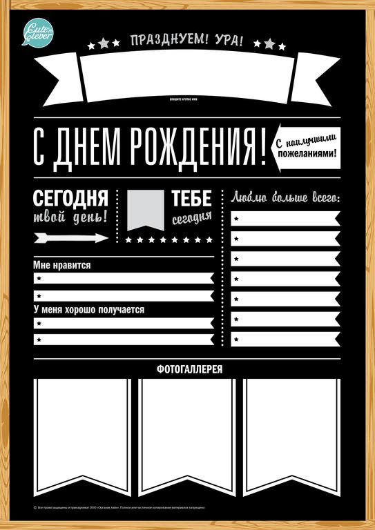У Ваших близких скоро День Рождения? Хотите подготовить что-то особенное? Заполните доску поздравлений в чёрно-белом исполнении формата А1. Такая доска-плакат украсит любой День Рождения и увлекательн... Показать описаниео расскажет гостям праздника все самое интересное об имениннике или имениннице. Все очень легко: просто впишите все умения главного героя вечеринки и вклейте забавные фото. Плакат развлечет гостей и порадует самого виновника торжества. P.S Если добавите карточки для гостей ко Дню Рождения, Ваша семейная история будет еще интересней.