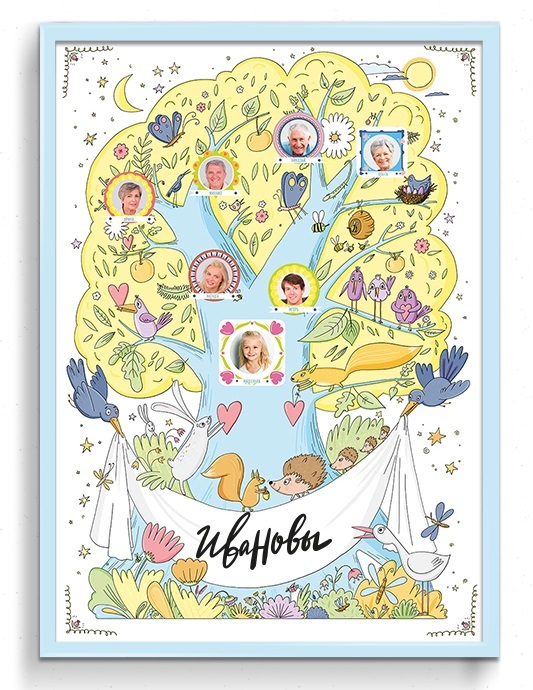 Хотите познакомить своих детей с историей семьи? Начните с семейного древа. Составьте его всей семьей и подключите к этому процессу бабушек и дедушек. Представляем вам оригинальный набор ТМ Cute’nClev... Показать описаниеer «Семейное древо. Детский» с милыми иллюстрациями в светлых тонах, который отлично украсит любую детскую комнату. В наборе: - плакат формата А2 с иллюстрациями художника для оформления вашего семейного древа - фоторамки – наклейки для оформления фотографий на семейном древе Как составлять семейное древо? • Соберите и распечатайте фотографии родственников до поколения, которое вам известно. Фотографии выбирайте не крупные, лучше делайте копию, чтобы можно было вырезать из нее портретную часть. • Приклейте вырезанное фото на нужно место на плакате. • Ориентировочные места для фото обозначены сердечками или гербами, но вы можете выстраивать все в своем порядке. • Обклейте все фотографии рамочками-наклейками – они скроют срезы на фотографиях. И придадут всему плакату завершенный и аккуратный вид. • Подпишите имена на рамках. • В графах Важные даты впишите Дни Рождения родственников, годовщины и любые важные семейные даты. Оформите Семейное древо в рамку и украсьте им комнату.