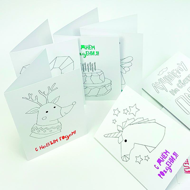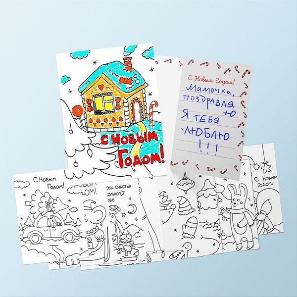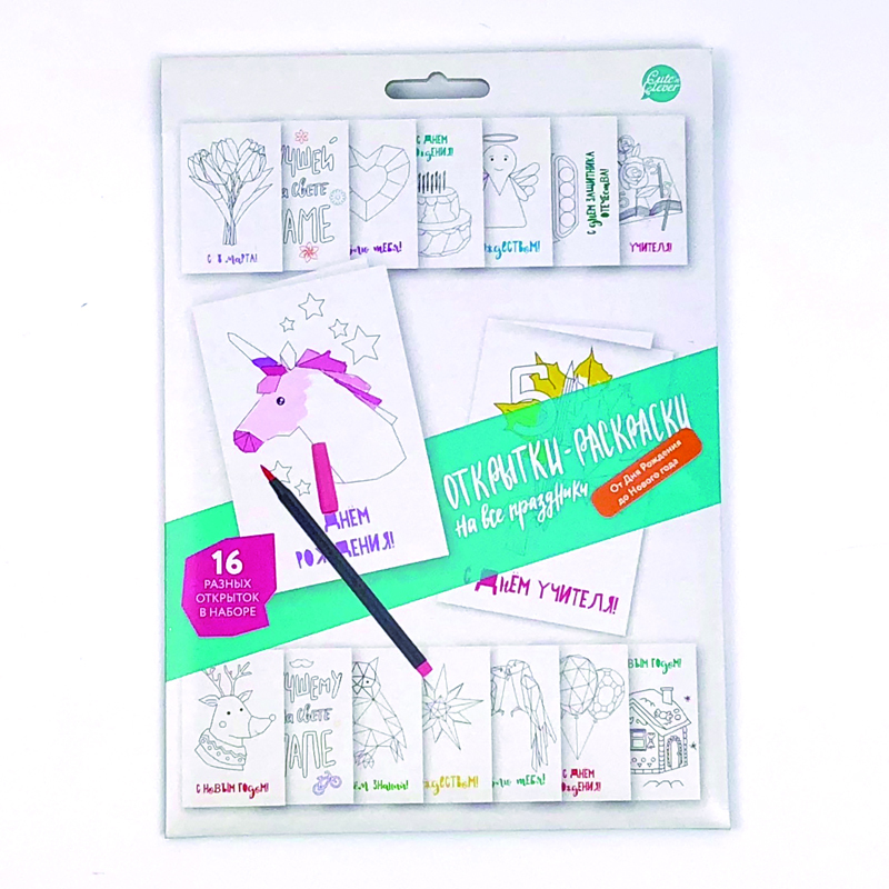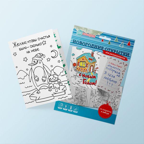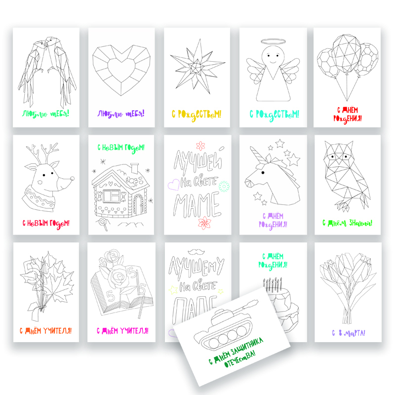 В наборе 10 азных иллюстрированных открыток для раскрашивания.