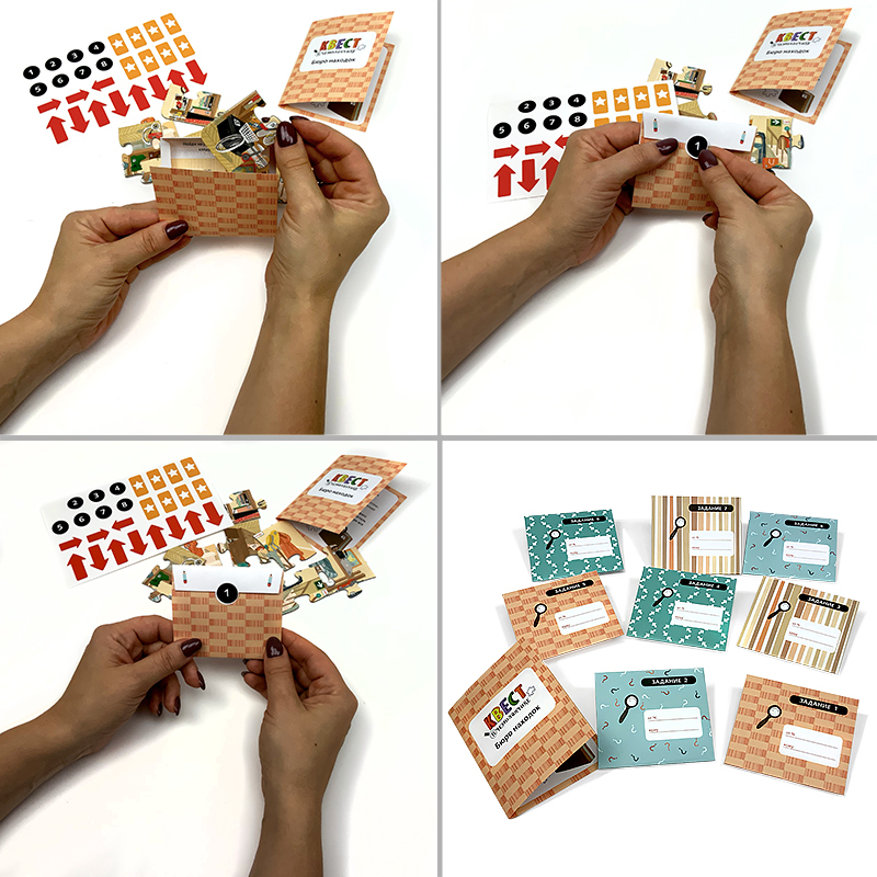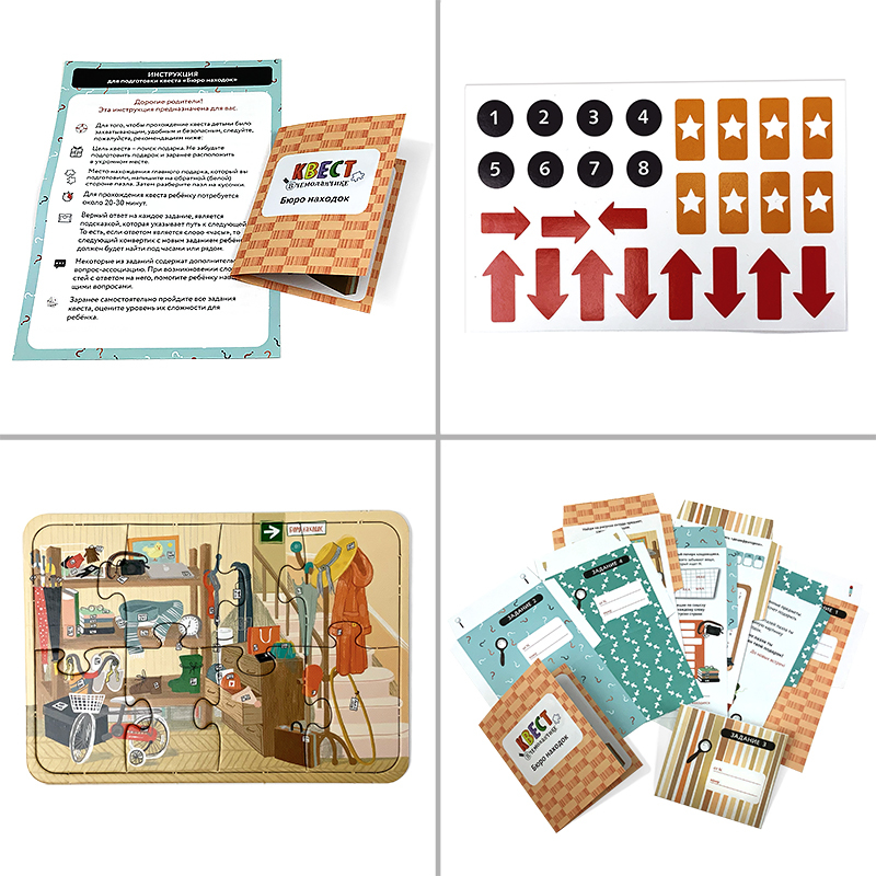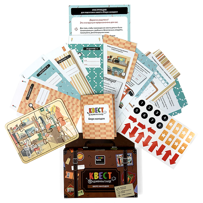Самое интересное и ожидаемое в любом празднике – это подарок. А что, если не просто вручить подарок, а сделать из этого настоящее приключение с шифрами, загадками, поиском подсказок? С набором «Квест ... Показать описаниев чемоданчике» это не только увлекательно, но еще и просто! Для всех любителей детективных историй - Квест в чемоданчике «Бюро находок» Прежде, чем удастся найти свой подарок, придется побывать на складе забытых вещей, прочитать скрытые послания, познакомиться с дешифратором и выполнить еще ряд увлекательных заданий. В наборе • Инструкция • Вводная карточка • 8 писем-конвертиков с интересными заданиями. • Тематический пазл из 8 элементов, с обратной стороны которого нужно вписать то заветное место, где спрятан подарок. • А также наклейки для конвертиков и для подсказок. Для подготовки квеста понадобится всего 15 минут. В каждое письмо-конвертик нужно вложить один элемент пазла. Спрятать конвертики в места согласно инструкции. Для подсказок можно также использовать наклейки стрелочки и звездочки. Рекомендовано детям от 5 до 12 лет.