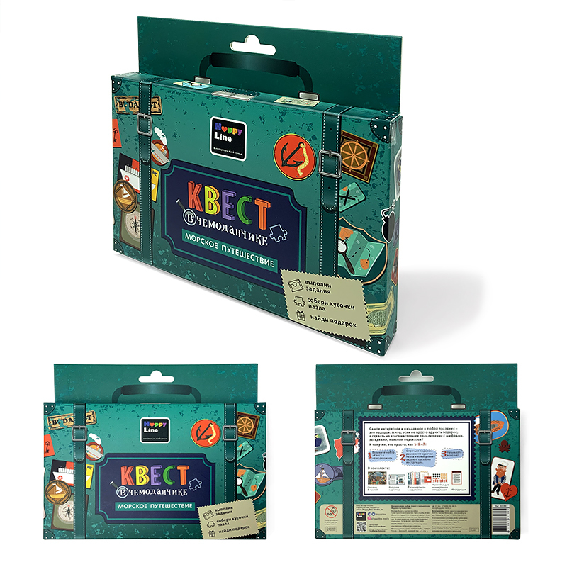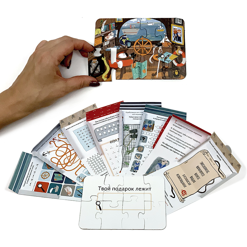 Самое интересное и ожидаемое в любом празднике – это подарок. А что, если не просто вручить подарок, а сделать из этого настоящее приключение с шифрами, загадками, поиском подсказок? С набором «Квест ... Показать описаниев чемоданчике» это не только увлекательно, но еще и просто! Для всех любителей приключений - Квест в чемоданчике «Морское путешествие» Прежде, чем удастся найти свой подарок, придется побывать в каюте капитана, разгадать морские загадки, познакомиться с азбукой Морзе и выполнить еще ряд увлекательных заданий. В наборе Инструкция Вводная карточка 8 писем-конвертиков с интересными заданиями. Тематический пазл из 8 элементов, с обратной стороны которого нужно вписать то заветное место, где спрятан подарок. А также наклейки для конвертиков и для подсказок. Для подготовки квеста понадобится всего 15 минут. В каждое письмо-конвертик нужно вложить один элемент пазла. Спрятать конвертики в места согласно инструкции. Для подсказок можно также использовать наклейки стрелочки и звездочки. Рекомендовано детям от 5 до 12 лет.