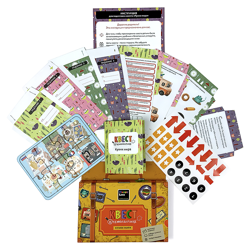 Самое интересное и ожидаемое в любом празднике – это подарок. А что, если не просто вручить подарок, а сделать из этого настоящее приключение с шифрами, загадками, поиском подсказок? С набором «Квест ... Показать описаниев чемоданчике» это не только увлекательно, но еще и просто! Для всех маленьких гурманов и любителей путешествий - Квест в чемоданчике «Кухни мира» Прежде, чем удастся найти свой подарок, придется угадать блюда разных стран, вспомнить названия напитков, познакомиться с дешифратором и выполнить еще ряд увлекательных заданий. В наборе Инструкция Вводная карточка 8 писем-конвертиков с интересными заданиями. Тематический пазл из 8 элементов, с обратной стороны которого нужно вписать то заветное место, где спрятан подарок. А также наклейки для конвертиков и для подсказок. Для подготовки квеста понадобится всего 15 минут. В каждое письмо-конвертик нужно вложить один элемент пазла. Спрятать конвертики в места согласно инструкции. Для подсказок можно также использовать наклейки стрелочки и звездочки. Рекомендовано детям от 5 до 12 лет.