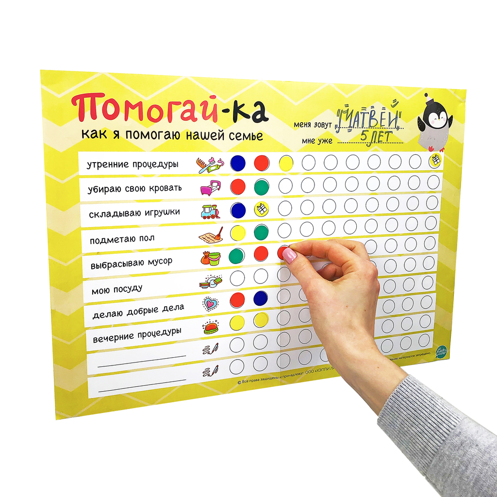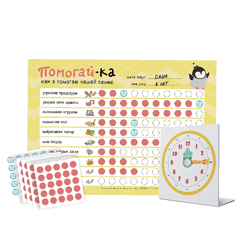 Плакат-мотиватор для приучения детей в игровой форме к домашним обязанностям. Заставлять силой детей что-то делать по дому - занятие бесполезное, а иногда и вредное. А собственное искреннее желание уб... Показать описаниеирать игрушки, заправлять постель и тому подобное, к сожалению, проявляют далеко не все детки. Но если ребенка вовлечь в игру, замотивировать чем-то интересным, то все возможно! Именно для этого создан плакат Помогай-КА!. В плакате перечесилены домашние обязанности, которые ребенок вполне может взять на себя. В пустые строки мама может вписать какие-то индивидуальные задачи. За каждое выполненное задание ребенок получает стикер. Каждый 10-й стикер призовой! Мама сама решает чем будет мотивировать своего кроху. Будь это просмотр мультика, совместных поход в зоопарк, совместная игра в дочки-матери, поход в гости, конфета, мороженое, да все что угодно. Главное, чтобы это было ценно для вашего малыша. В набор входит 1 плакат и 100 стикеров.