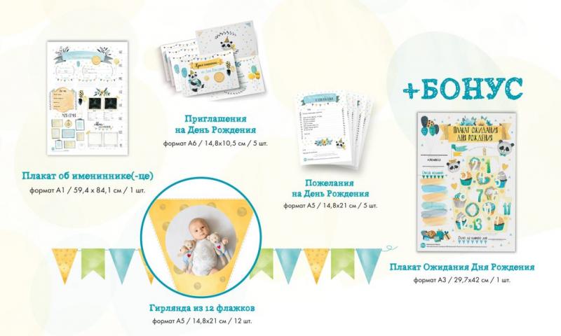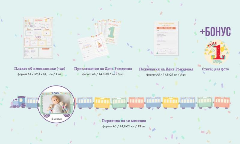 Скоро самый важный праздник - Первый День Рождения? Красиво оформить праздник можно самостоятельно и без лишних затрат – в помощь Набор для подготовки первого Дня Рождения "Мой Первый Год", иллюстриро... Показать описаниеванный художником. ЧТО ВНУТРИ: Приглашения на День Рождения (5 приглашений) Плакат об имениннике для заполнения (формат А1, размер 59,4 х 84,1 см) Карточки Пожелания в День Рождения (5 карточек) Праздничная гирлянда для фотографий Стикер для малыша Мой Первый Год 25 предметов для Вашего праздника в 1 коробке! В наборе 5 приглашений на День Рождения, чтобы пригласить родных и близких на праздник красиво! Нужно просто заполнить иллюстрированные приглашения и раздать всем, кого хотите пригласить на самый важный праздник. Плакат об имениннике для заполнения поможет на празднике красочно рассказать все самое интересное из первого года жизни именинника. Заполнить его совсем не сложно: вклеиваем фото именинника при рождении и в годик, заполняем главные достижения и события за год - фотозона для Дня Рождения готова. Также для Дня Рождения пригодится праздничная гирлянда, куда можно вклеить 12 фото именинника (можно фото с 1 по 12 месяц, чтобы показать как рос и менялся малыш каждый месяц, можно с достижениями и событиями, можно с членами семьи - тут только Ваша фантазия:)). На празднике не будет скучно с карточками Пожелания в День Рождения. Эти карточки следует раздать гостям на празднике для заполнения и вместо банальных пожеланий, у именинника будут оригинальные и интересные пожелания на будущее. Гости предположат, кем малыш сможет стать, когда вырастет, чего он сможет достигнуть и т.д. Как же интересно их будет читать и посмотреть, что сбылось, когда малыш достигнет совершеннолетия!