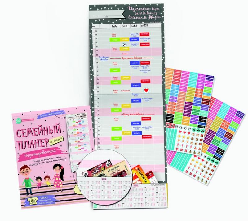 Семейный календарь-планер - нужная новинка в интересах всей семьи! Мама всегда занята! Папа тоже! И дети! Как запомнить планы каждого и организовать семейный поход в театр? Или не забыть про соревнова... Показать описаниения сына и выступление дочери? Семейный ПЛАНЕР поможет каждому члену семьи вписать или вклеить свои дела, а также быть в курсе планов всех членов семьи. Планер можно вести всем вместе, а можно доверить это лучшему организатору семейных дел – маме. С ним Мама помнит все! :) ВНУТРИ: - перелистной календарь-планер; - более 350 многоразовых наклеек; - удобный карман для хранения самого нужного (билетов, квитанций, талонов к врачу, списков покупок и т.д.) Приятный бонус: Целая страница для важных телефонных номеров.