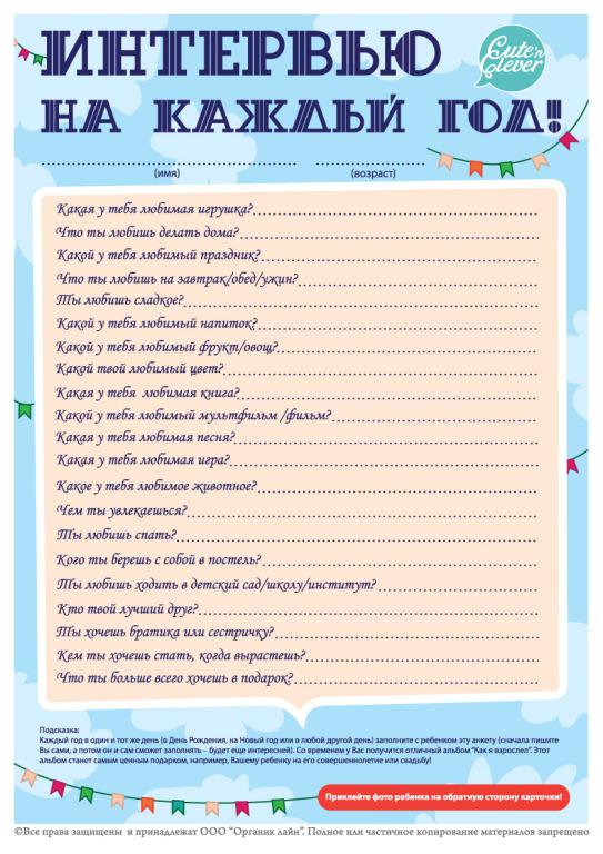 Карточки ИНТЕРВЬЮ КАЖДЫЙ ГОД. Каждый год желательно в один и тот же день (на Новый год, на День Рождения и т.д.) мама проводит с ребенком интервью, задавая одни и те же вопросы. И вписывая ответы в ка... Показать описаниерточку. Позже малыш сам сможет вписывать. А на обратную сторону карточки мы рекомендуем приклеивать фото ребенка в этот год.