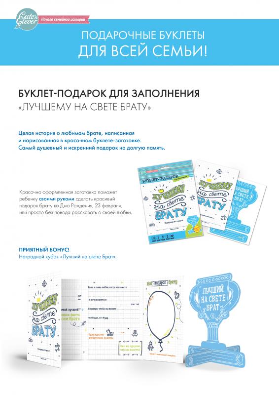 Целая история о любимом брате, написанная и нарисованная ребенком – какой подарок может быть лучше?! Эта мини-история о брате станет очень душевным подарком со смыслом, сохранив ее на долгие годы в се... Показать описаниемейном альбоме, через много лет Вам будет безумно интересно прочитать ее вновь. Внутри красочно оформленный буклет–заготовка для ребенка, чтобы красиво и своими руками поздравить брата с Днем Рождения, 23 февраля , или просто без повода рассказать о своей любви. Приятный бонус: Наградной кубок "Лучший на свете Брат", чтобы брат гордо поставил у себя! Cute'n Clever - начало семейной истории!