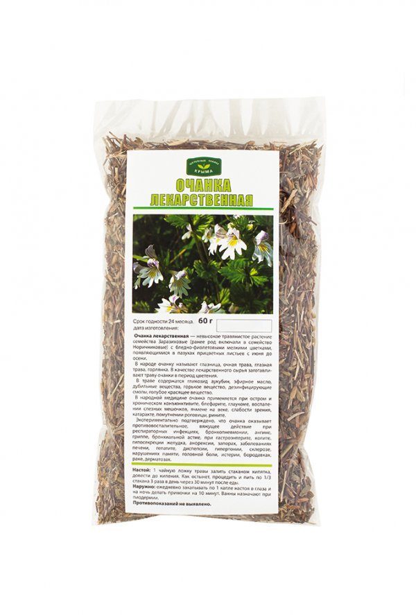 Очанка лекарственная - невысокое травянистое растение семейства Заразихитовые с бледно-фиолетовыми мелкими цветками, появляющимися в пазухах прицветных листьев с июня до осени. В народе очанку называю... Показать описаниет глазница, очная трава, глазная трава, горлянка. В качестве лекарственного сырья заготавливают траву очанки в период цветения. В траве содержатся гликозид аукубин, эфирное масло, дубильные вещества, горькое вещество, дезинфицирующие смолы, голубое красящее вещество. В народной медицине очанка применяется при остром и хроническом конъюктивите, блефарите, глаукоме, воспалении слезных мешочков, ячмене на веке, слабости зрения, катаракте, помутнении роговицы, рините. Экспериментально подтверждено, что очанка оказывает противовоспалительное, вяжущее действие при респираторных инфекциях, бронхопневмонии, ангине, гриппе, бронхиальной астме, при гастроэнтерите, колите, гипосекреции желудка, анорексии, запорах, заболеваниях печени, гепатите, диспепсии, гипертонии, склерозе, нарушениях памяти, головной боли, истерии, бородавках, раке, дерматозах. Способ приготовления: Настой. 1 ч.л. травы залить стаканом кипятка, довести до кипения. Как остынет, процедить и пить по 1/3 стакана 3 раза в день через 30 минут после еды. Наружно. Ежедневно закапывать по 1 капле настоя в глаза и на ночь делать примочки на 10 минут. Ванны назначают при пиодермии.
