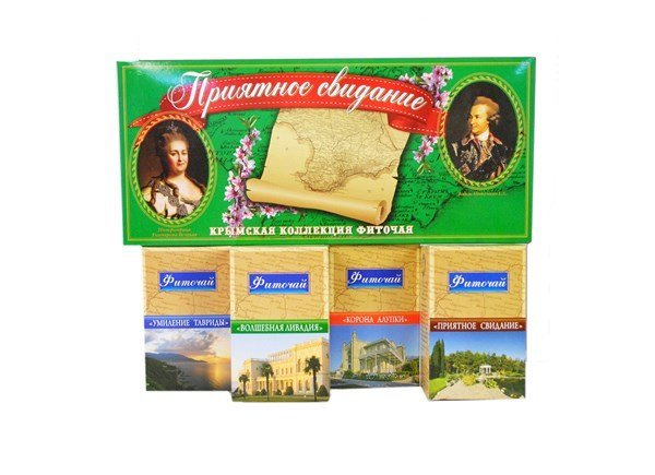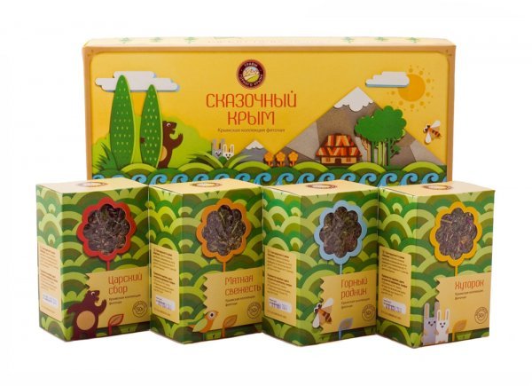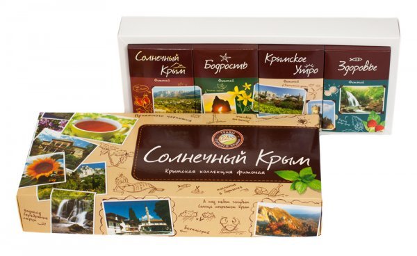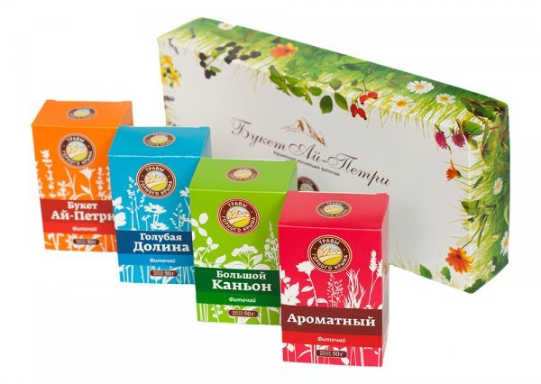 В состав подарочной коробки входят черыре чая из чайной коллекции:"Букет Ай-Петри", "Ароматный", "Голубая Долина","Большой Каньон". Букет Ай-Петри Состав:Душица, роза чайная, лист ежевики, шалфей, лав... Показать описаниеанда, мелисса, чабрец, плоды шиповника, листья мяты, цветы боярышника, зверобой, бессмертник. Чистый воздух, прозрачные горные ручьи и щедрое солнце делают склоны Ай-Петри идеальным местом для роста лечебных трав. Бережно собранные они создают напиток с прекрасным вкусовым букетом, приятным цветом и превосходным ароматом. Особый колорит напитку придают входящие в его состав лепестки крымской розы. Входящие в состав чая железосодержащие травы способствуют повышению уровня гемоглобина в крови. Витамин С придаёт бодрость, укрепляет иммунитет. Богатый витаминный состав трав, ягод, высокое содержание жизненно необходимых микроэлементов обеспечивают улучшение обменных процессов в организме на клеточном уровне, усиливают вывод токсинов, оказывают тонизирующее действие и улучшают настроение. Ароматный. Состав: Душица, мелисса, чабрец, лепестки розы чайной, лист ежевики, зверобой, мята, лист малины, плоды шиповника,лаванда, плоды кизила. Этот фиточай обладает прекрасными ароматическими и целебными свойствами: облегчает боли, успокаивает нервную систему и укрепляет организм.Входящие в состав чая железосодержащие травы способствуют повышению уровня гемоглобина в крови. Витамин С придаёт бодрость, укрепляет иммунитет. Богатый витаминный состав листьев фруктовых деревьев, а также трав, хвои и ягод, высокое содержание жизненно необходимых микроэлементов обеспечивают улучшение обменных процессов в организме на клеточном уровне, усиливают вывод токсинов, оказывают тонизирующее действие и улучшают настроение. Голубая долина. Состав:Лист ежевики, роза чайная, шалфей, чабрец, мята, эхинацея, зверобой, мелисса, плоды шиповника, бессмертник. Фиточай с мятой, мелиссой, лепестками розы имеет чудесный освежающий вкус и тонкий аромат. Эхинацея, входящая в состав чая является прекрасным иммуномоделятором. Шиповник улучшает обмен веществ в организме и повышает работоспособность. Комбинация этих целебных трав обладает уникальным общеукрепляющим и тонизирующим действием. Большой каньон. Состав:Пустырник, лаванда, мята, ромашка, душица, шиповник, цвет боярышника, лист ежевики, рябина черноплодная, иван-чай. Травяной сбор - это настоящая сокровищница витаминов и микроэлементов, которые оказывают благотворное действие на здоровье. Пустырник и мята нормализуют сон. Иван-чай и шиповник активизируют защитные силы организма. Лаванда придает напитку изысканный нежный аромат. При приеме чая улучшается настроение, нормализуется сон, стихают боли в мышцах, суставах и позвоночнике. Особенно рекомендуется лицам пожилого возраста. Чай оказывает общеукрепляющее действие.