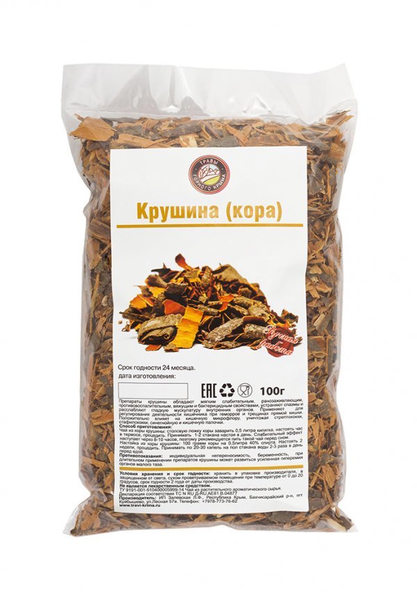 Препараты крушины обладают мягким слабительным, ранозаживляющим, противовоспалительным, вяжущим и бактерицидным свойствами, устраняют спазмы и расслабляют гладкую мускулатуру внутренних органов. Приме... Показать описаниеняют для регулирования деятельности кишечника при геморрое и трещинах прямой кишки. Положительно влияет на кишечную микрофлору, уничтожая стрептококки, стафилококки, синегнойную и кишечную палочки. Способ приготовления: Чай из коры крушины: 1 ст.л. коры заварить 0,5 л кипятка, настоять чай в термосе, процедить. Принимать 1-2 стакана настоя в день. Слабительный эффект наступает через 8-10 часов, поэтому рекомендуется пить такой чай перед сном. Настойка из коры крушины: 100 грамм коры на 0,5 л 40% спирта. Настоять 2 недели, процедить. Принимать по 20-30 капель на пол стакана воды 2-3 раза в день перед едой.