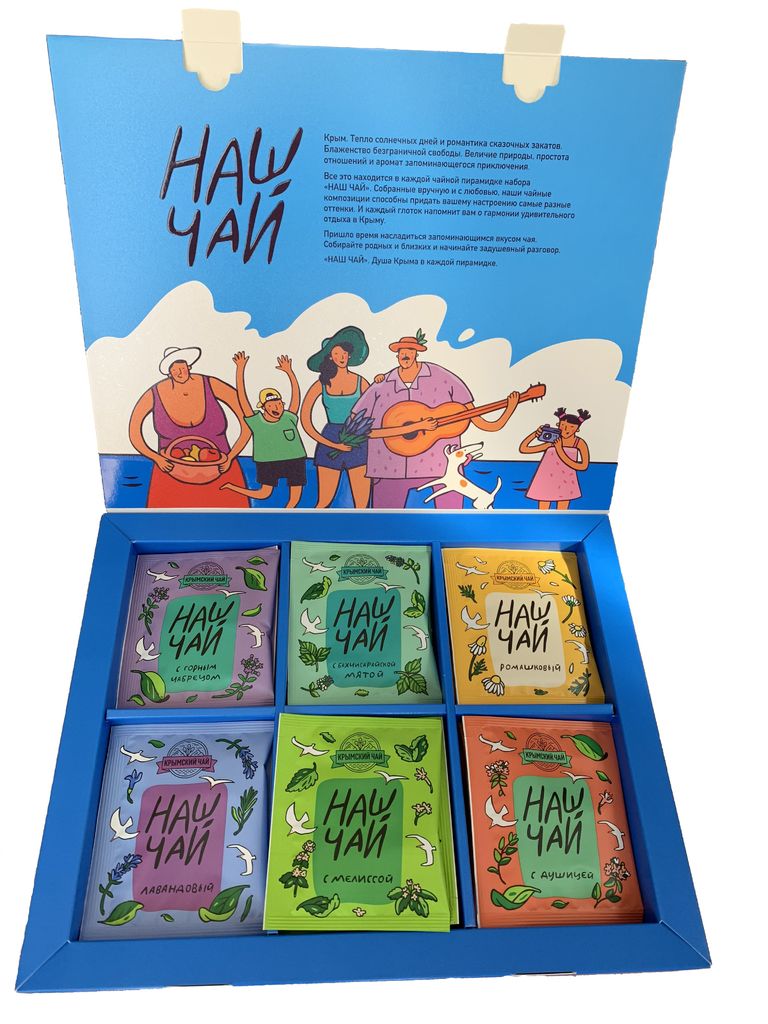 Состав: чёрный чай с чабрецом, чёрный чай с душицей, чёрный чай с ромашкой, зелёный чай с мелиссой, зеленый чай с мятой, лавандовый. Размер коробки: 32*26*5 см. Подарочный набор саше «Наш чай» отличае... Показать описаниется обилием вкусов и уникальной технологией изготовления. Вы будете наслаждаться каждым глотком натурального напитка из крымских трав благодаря особым условиям ферментации, которые использует производитель. Насыщенный вкус и незабываемый аромат делают каждую пирамидку особенной. Заваривая чай (набора хватит на 30 чайников), вы будете погружаться в воспоминания об отпуске. Покупая «Наш чай», вы сможете насладиться душицей, лавандой, мелиссой, бахчисарайской мятой, чабрецом и ромашкой. Эти крымские травы в пирамидках станут отличным подарком для родных и близких. Такой сувенир будет напоминать о поездке в Крым, где спокойное Черное море сочетается с величественными горными массивами. В Крыму размеренный отдых на пляже сменяется насыщенными экскурсиями, поэтому каждый день становится уникальным. Вы также можете заказать набор крымского чая с логотипом, который подчеркнет индивидуальность вашей компании.