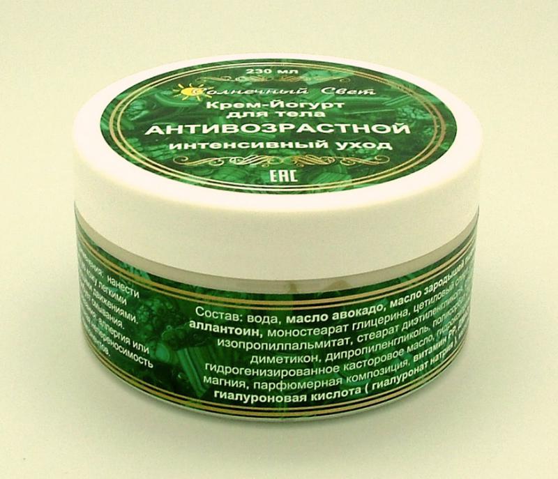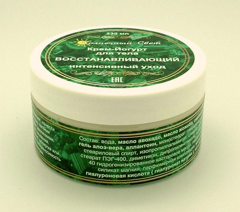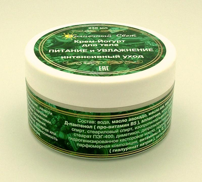 Рекомендован для всех типов кожи. Крем-йогурт интенсивно питает кожу, придает ей бархатистость, гладкость и ухоженный вид, увлажняет, снимает раздражение, препятствует старению кожи. Подходит для ежед... Показать описаниеневного применения. Способ применения: нанести на чистую кожу легкими массирующими движениями. Не требует смывания. Противопоказания: аллергия или индивидуальная непереносимость компонентов. Состав: вода, масло авокадо, масло ши, масло жожоба, сорбитол, Д-пантенол ( про-витамин В5 ), аллантоин, моностеарат глицерина, цетиловый спирт, стеариловый спирт, изопропилпальмитат, стеарат диэтиленгликоля, стеарат ПЭГ-400, диметикон, дипропиленгликоль, полисорбат 20, ПЭГ-40 гидрогенизированное касторовое масло, гидроксипропилгуар, силикат магния, парфюмерная композиция, витамины А, Е, F, гиалуроновая кислота ( гиалуронат натрия ), метилизотиазолон. Д-пантенол ( про-витамин В5 ) — увлажняет, успокаивает, снимает раздражение и зуд, обладает сильным омолаживающим и разглаживающим эффектом, восстанавливает и защищает кожу, снимает воспаление Аллантоин (Allantoin) обладает кератолическим действием, способствующим клеточной регенерации кожи, быстрому заживлению ссадин и трещин, снятию раздражений. Он смягчает роговой слой, стимулирует удаление отмерших клеток, увлажняет кожу. Обнаружена антиоксидантная активность аллантоина, поэтому он является эффективным компонентом антивозрастных средств ухода для кожи. Аллантоин подавляет рост бактерий, не токсичен и не вызывает воспалительных реакций, эффективен даже в малых концентрациях. Витамин А препятствует чрезмерному ороговению тканей кожи, увеличивает метаболическую активность. Витамин Е предупреждает преждевременное старение кожи, обладает противовоспалительным действием Витамин F - витамин эластичности: предотвращает сухость и шелушение, увлажняет и регулирует рН кожи. Гиалуроновая кислота ( гиалуронат натрия ) — естественный компонент кожи человека — имеет высокие увлажняющие свойства, предупреждает потерю воды, способствует регенерации тканей без образования шрамов, делает кожу более мягкой, гладкой и нежной.
