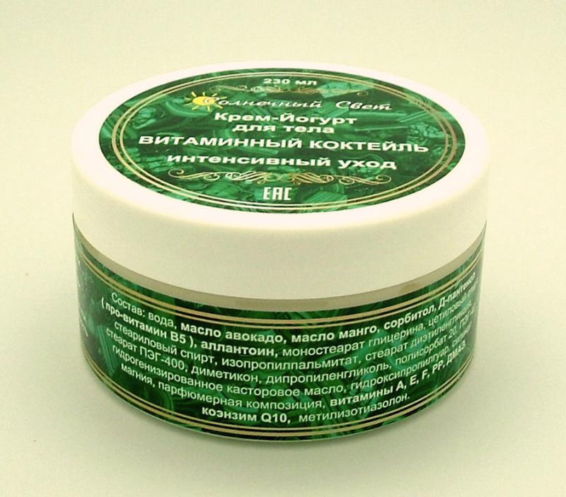 Рекомендован для всех типов кожи. Крем-йогурт насыщает кожу витаминами, придает ей бархатистость и ухоженный вид, увлажняет, тонизирует, разглаживает, снимает раздражение, препятствует старению кожи. ... Показать описаниеПодходит для ежедневного применения. Способ применения: нанести на чистую кожу легкими массирующими движениями. Не требует смывания. Противопоказания: аллергия или индивидуальная непереносимость компонентов. Состав: вода, масло авокадо, масло манго, сорбитол, Д-пантенол ( про-витамин В5 ), аллантоин, моностеарат глицерина, цетиловый спирт, стеариловый спирт, изопропилпальмитат, стеарат диэтиленгликоля, стеарат ПЭГ-400, диметикон, дипропиленгликоль, полисорбат 20, ПЭГ-40 гидрогенизированное касторовое масло, гидроксипропилгуар, силикат магния, парфюмерная композиция, витамины А, Е, F, PP, ДМАЭ, коэнзим Q10, метилизотиазолон. Д-пантенол ( про-витамин В5 ) — увлажняет, успокаивает, снимает раздражение и зуд, обладает сильным омолаживающим и разглаживающим эффектом, восстанавливает и защищает кожу, снимает воспаление Аллантоин (Allantoin) обладает кератолическим действием, способствующим клеточной регенерации кожи, быстрому заживлению ссадин и трещин, снятию раздражений. Он смягчает роговой слой, стимулирует удаление отмерших клеток, увлажняет кожу. Обнаружена антиоксидантная активность аллантоина, поэтому он является эффективным компонентом антивозрастных средств ухода для кожи. Аллантоин подавляет рост бактерий, не токсичен и не вызывает воспалительных реакций, эффективен даже в малых концентрациях. Витамин А препятствует чрезмерному ороговению тканей кожи, увеличивает метаболическую активность. Витамин Е предупреждает преждевременное старение кожи, обладает противовоспалительным действием Витамин F - витамин эластичности: предотвращает сухость и шелушение, увлажняет и регулирует рН кожи. Коэнзим Q-10 — «витамин молодости» : замедляет процессы старения, мощный антиоксидант. Витамин РР в свободной и ионизированной форме укрепляет стенки сосудов, улучшает кровоснабжение тканей кожи, усиливает дыхательные и обменные процессы в мембранах кожи, способствует сужению пор, улучшению цвета лица, зрительно разглаживает морщины. Присутствие диметиламиноэтанола ( ДМАЭ) в ионизированной форме стимулирует синтез ацетилхолина, недостаток которого вызывает обвисание и старение кожи. На сегодняшний день ДМАЭ пользуется репутацией эффективного защитного средства от старения. Он играет существенную роль в синтезе фосфолипидов, является непременным компонентом клеточной мембраны и, как следствие, является важным «строительным» элементом при обновлении клеток кожи. Значительное количество ДМАЭ содержится в рыбе, икре и других морепродуктах.