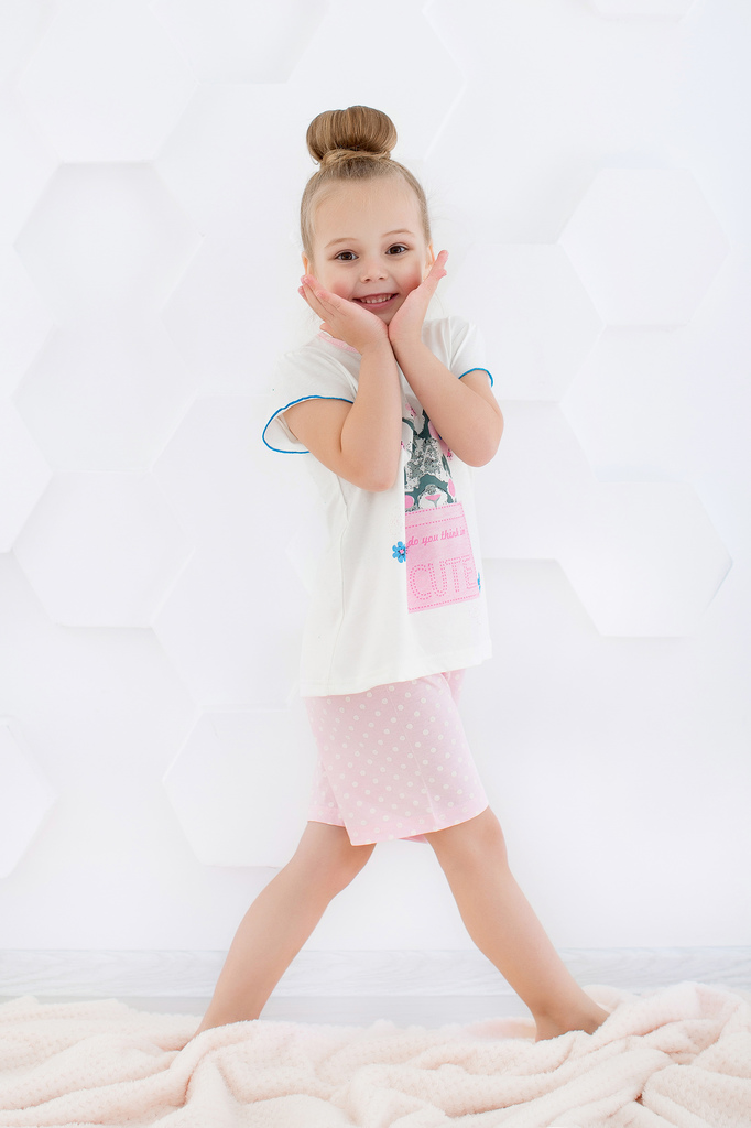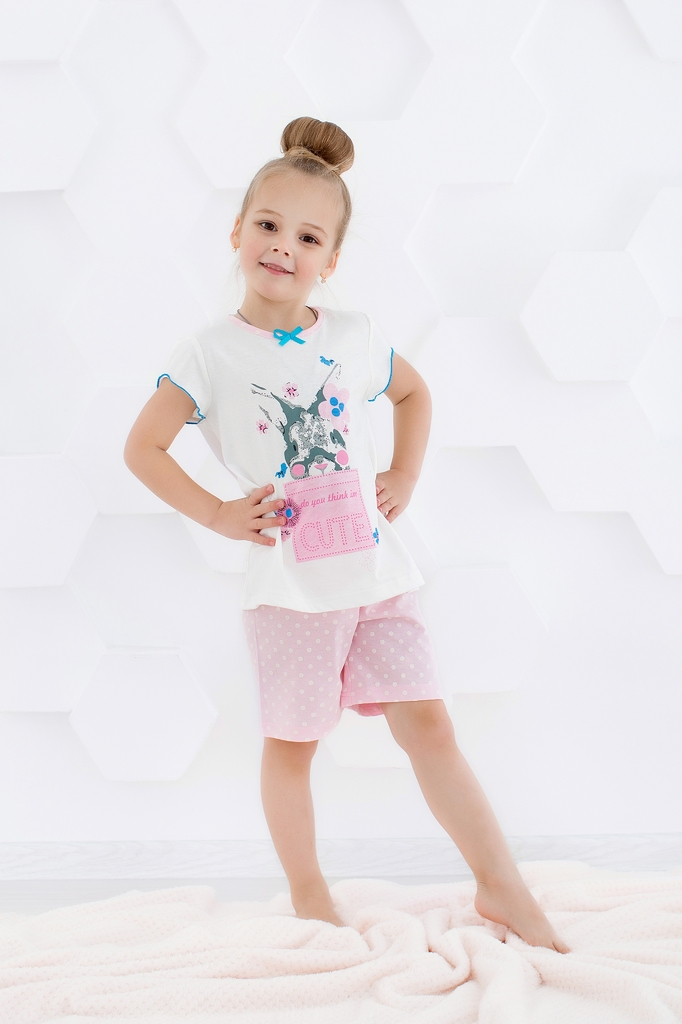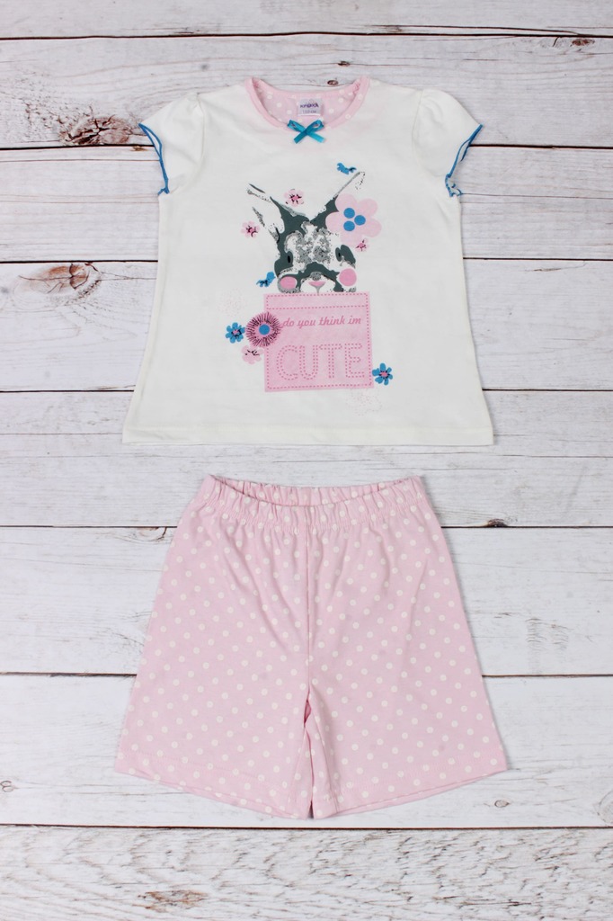 Удобная и легкая пижама для отличного отдыха и крепкого сна! Пижама представляет собой футболку с коротким рукавом и шорты на резинке. Футболка выделяется нарядной аппликацией в виде прелестного зайчи... Показать описаниека. По краям рукава имеют аккуратные ажурные оборки. Горловина обработана под окантовку. Шорты выделяются контрастным узором в белый горошек. Характеристики: прелестная летняя пижама; яркий дизайн; футболка с коротким рукавом; узор в горошек; основной материал: 100% хлопок; молочно-розовый; машинная стирка; держать вдали от огня.