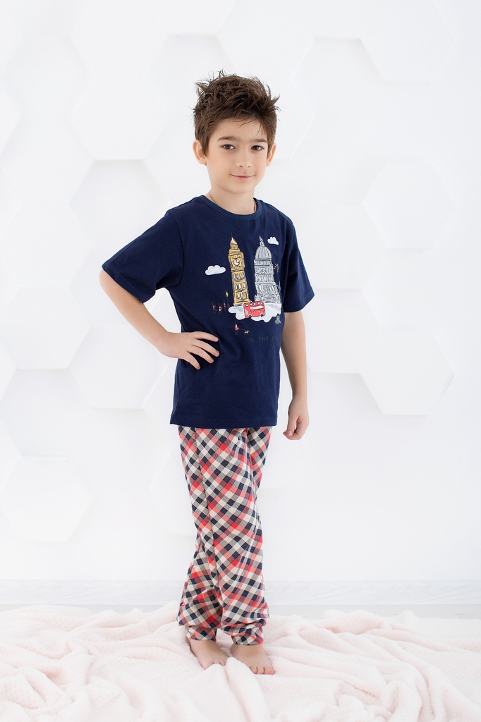 Пижама в английской тематике выполнена из мягкого хлопкового материла, а за счет наличия эластичных вставок она прекрасно сидит по фигуре, легко надевается и обеспечивает свободу движений во время сна... Показать описание и бодрствования. Короткий рукав в сочетании с длинными штанами отлично подходит для любого времени года. Горловина обрабатывается под планку, штаны на манжетах. Футболку украшает стилизованный принт Лондона. Ткань - кулирная гладь 100% ХЛОПОК. Характеристики: выполнена из мягкого хлопка; эластичные манжеты, пояс и горловина; короткий рукав; оригинальный принт; машинная стирка при 30c; 100% хлопок; держать вдали от огня.