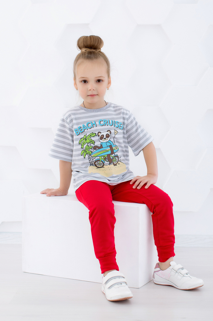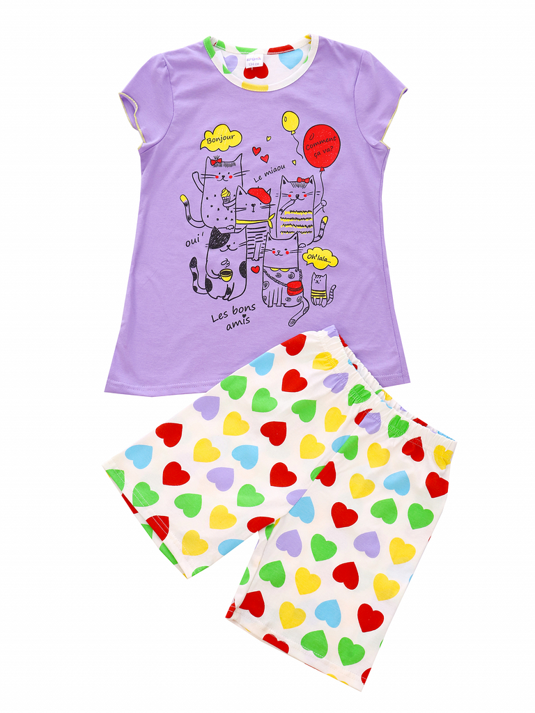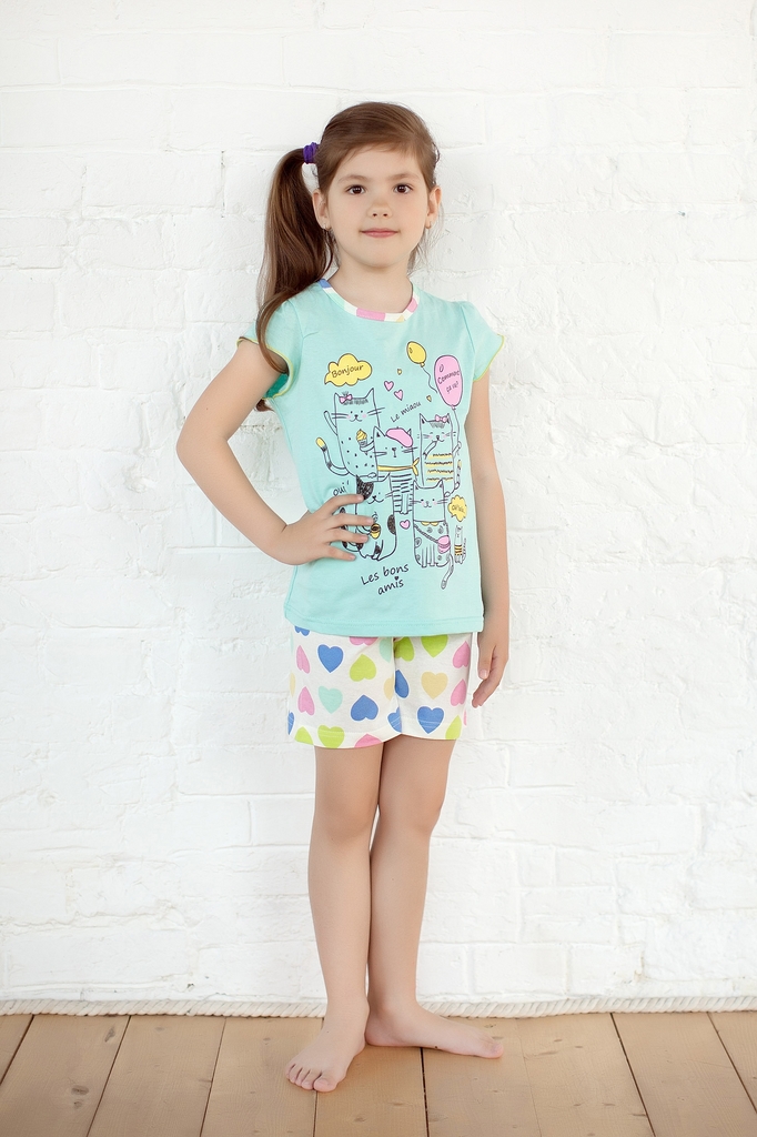 Удобный и легкий костюм для отличного отдыха и весёлого времяпрепровождения! Костюм представляет собой футболку с коротким рукавом и шорты на резинке. Футболка выделяется нарядным и оригинальным принт... Показать описаниеом. В плечвых швах сделана сборка, а низ рукавов обрабатывается на краевой машине. Горловина обработана под окантовку в цвет шорт. На внутренней стороне спинки в области горловины пришивается оригинальнй элемент из той же ткани, что и них модели. Шорты выделяются контрастным узором в разноцветное сердечко. Характеристики: прелестный летний костюм; яркий дизайн; футболка с коротким рукавом; узор в сердечко; 100% хлопок; ментол; машинная стирка; держать вдали от огня.