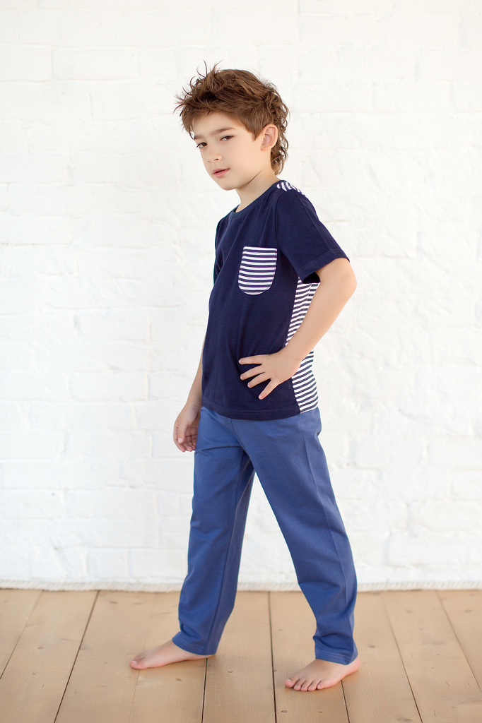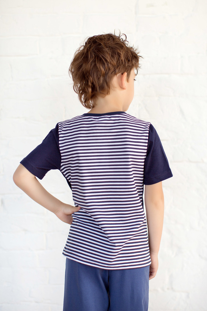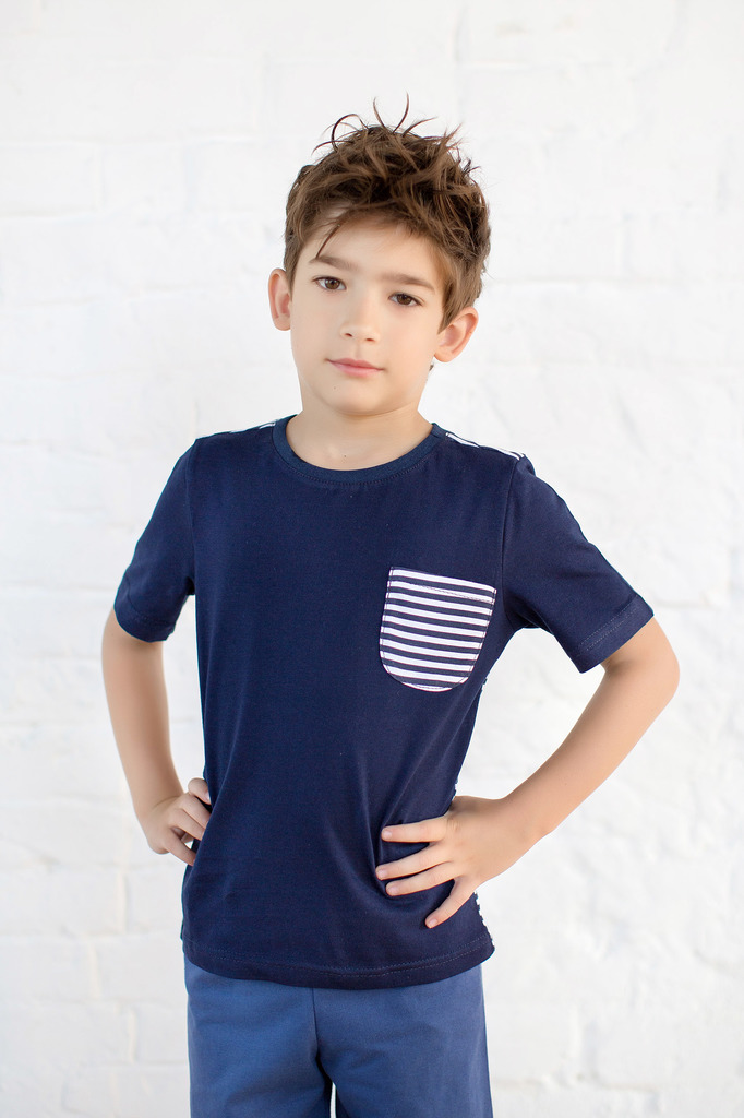 Футболка выполнена в мальчиковой цветовой гамме, имеет короткие рукава и отличается мягким и приятным на ощупь материалом. Контрастное цветовое решение полочки и спинки. Плечевый швы смещены на полочк... Показать описаниеу, что создаёт очень интересный и необычный эффект. На передней стороне пришивается кармашек из из той же ткани, что и спинка. Горловина обрабатывается под планку из эластичной ткани. Характеристики: легкая футболка классического исполнения; оригинальное исполнение; короткий рукав; 100% хлопок; эластичная горловина; машинная стирка; держать вдали от огня.