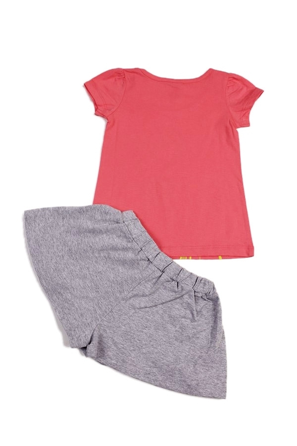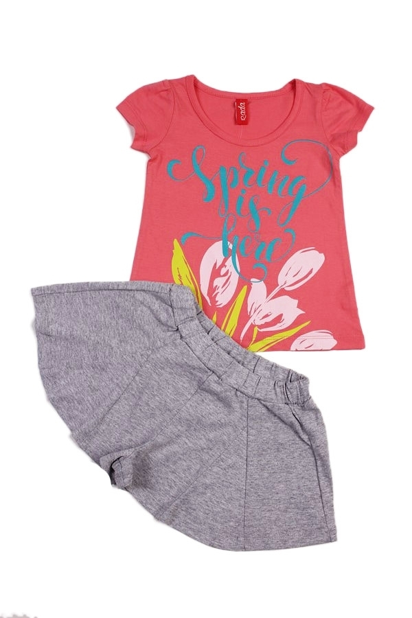 Красивый и стильный летний наряд для маленькой принцессы. Комплект состоит из футболки розового цвета, с ярким прнтом и однотонных, серых шортиков (форма клеш). Пояс резинка. Материал 100% хлопок. Удо... Показать описаниебный вариант для прогулок, дома и детского сада. Материал: 100% хлопок. Больше картинок и таблица размеров на странице.
