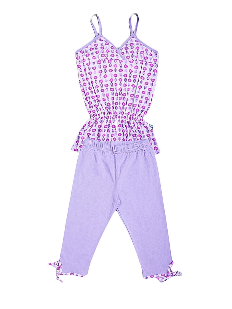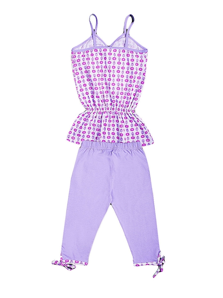 Легкий домашний комплект для девочки, состоящий из майки и капри. Майка: тонкие бретели, на груди есть фигурный вырез, длина до середины бедра, в области талии майка собрана на резинку. Цвет белый, с ... Показать описаниегустым цветочным рисунком розового и сиреневого цвета. Линия груди и бретели отделаны сиреневой бейкой. Капри: высокая посадка, пояс-резинка, длина до колена. Цвет сиреневый, без рисунков и надписей. Внизу штанин есть небольшие фигурные разрезы, отделанные бейкой в тон майке. Материал комплекта 100% хлопок. Материал: 100% хлопок. Больше картинок и таблица размеров на странице.