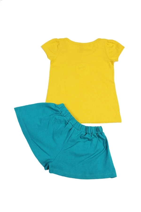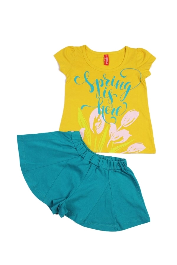 Красивый и стильный летний наряд для маленькой принцессы. Комплект состоит из футболки желтого цвета, с ярким прнтом и однотонных, зеленных шортиков (форма клеш). Пояс резинка. Материал 100% хлопок. У... Показать описаниедобный вариант для прогулок, дома и детского сада. Материал: 100% хлопок. Больше картинок и таблица размеров на странице.