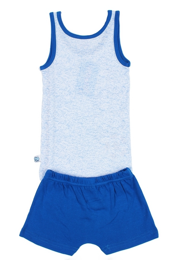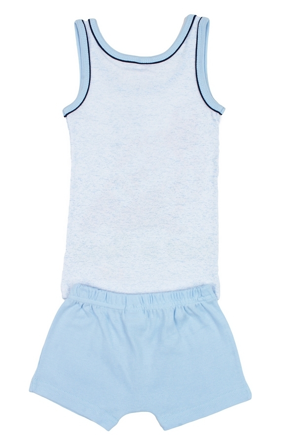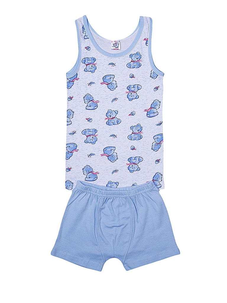 Комплект для мальчика, состоящий из классической майки и трусиков-боксеров. Майка: прямой крой, глубокий вырез горловины. Цвет светло-голубой, вырез горловины и пройма отделаны светло-голубой бейкой. ... Показать описаниеМайка украшена принтом изображением мишек (по всему изделию). Трусики: облегающие тело боксеры на резинке, цвет светло-голубой, без рисунков и надписей. Материал 100% хлопок. Удобный, не сковывающий движений вариант на каждый день. Материал: 100% хлопок. Больше картинок и таблица размеров на странице.