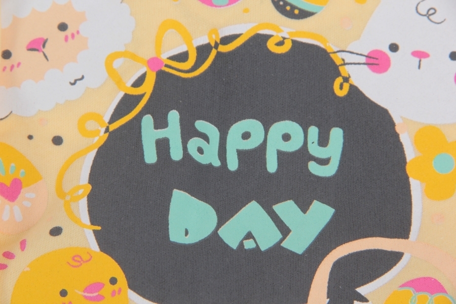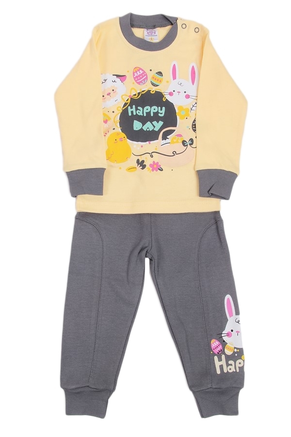 Комплект удобной домашней одежды для девочки. Состоит из джемпера с длинными рукавами на манжетах и брюк свободного кроя, с поясом-резинкой, стандартной высокой посадкой и манжетами на щиколотках. У д... Показать описаниежемпера прямой крой и округлый вырез горловины. На плече есть две кнопки-застежки. Цвет джемпера желтый, горловина и манжеты серые. Спереди есть большой рисунок, на котором изображен зайчик, ягненок, цыпленок и надпись Happy day» в окружении цветов и ленточек. Цвет штанов серый, внизу на левой штанине изображен такой же зайчик, как на джемпере. Материал комплекта 100% хлопок. Материал: 100% хлопок. Больше картинок и таблица размеров на странице.
