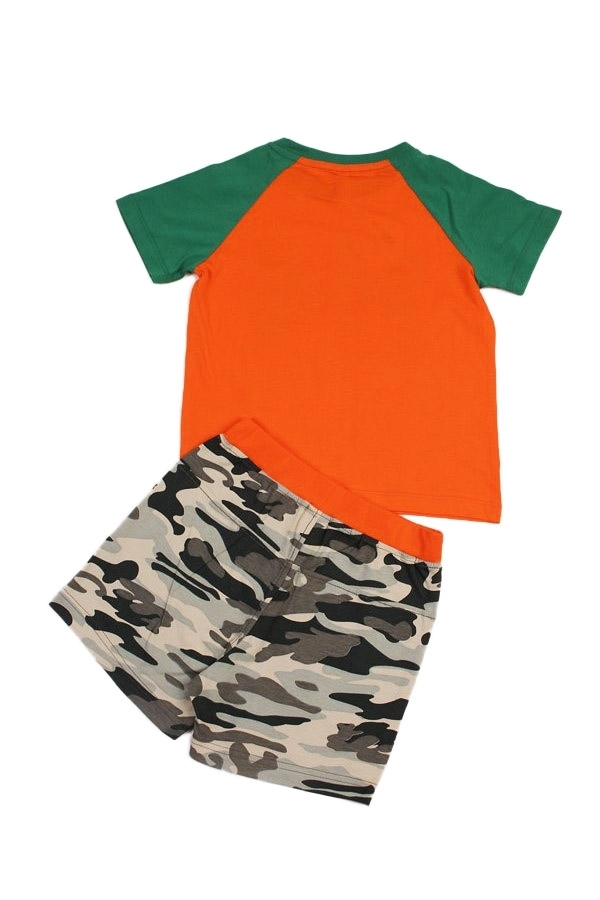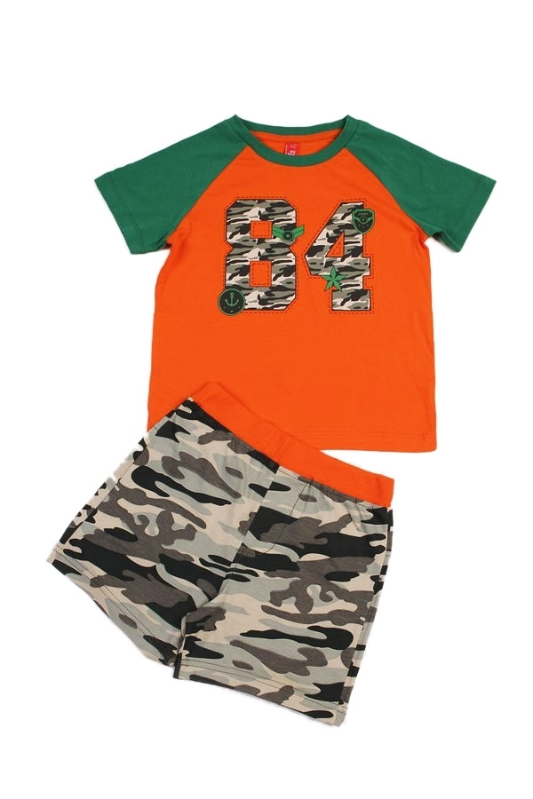 Комплект из натурального хлопка для мальчика. В составе комплекта- футболка и шорты. Футболка ярко оранжевого цвета с зелыми округлым вырезом горловины и рукавами. Отделана принтом в виде цифр расцвет... Показать описаниеки комуфляж. Шорты оформлены в цвете комуфляж с оранжевой окантовкой на поясе. Отличный, комфортный комплект на жаркую погоду и для повседневной носки. Материал: 100% хлопок. Больше картинок и таблица размеров на странице.