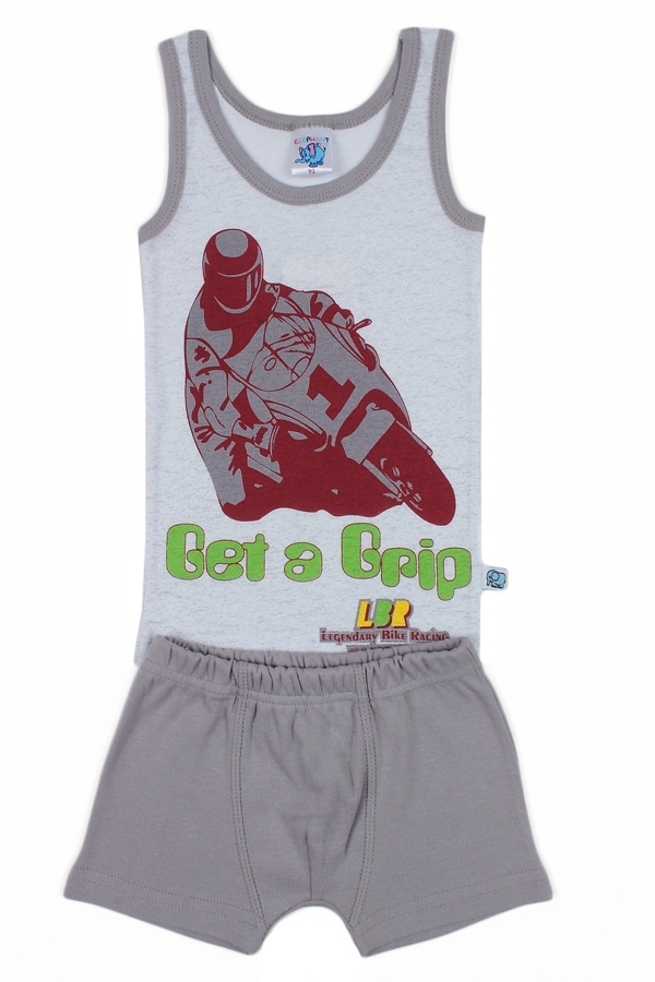 Комплект для мальчика, состоящий из классической майки и трусиков-боксеров. Майка: прямой крой, глубокий вырез горловины. Цвет светло-серый, вырез горловины и пройма отделаны серой бейкой. Майка украш... Показать описаниеена принтом изображение гонщика на мотоцикле. Трусики: облегающие тело боксеры на резинке, цвет серый, без рисунков и надписей. Материал 100% хлопок. Удобный, не сковывающий движений вариант на каждый день. Материал: 100% хлопок. Больше картинок и таблица размеров на странице.