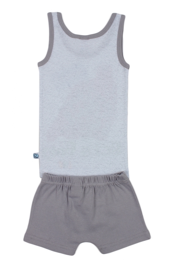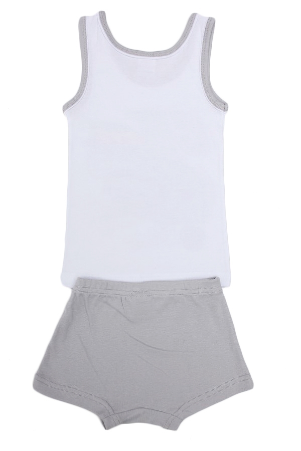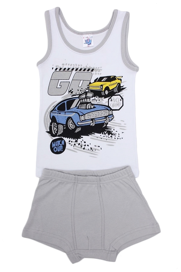 Комплект х/б белья для мальчика, состоящий из майки и трусиков-боксеров. Майка: прямой крой, округлая горловина средней глубины, широкие бретели, длина изделия до середины бедра. Трусы-боксеры на рези... Показать описаниенке. Цвет комплекта белый/серый. На майке есть большое изображение автомобиля. Трусики- серые однотонные. Материал: 100% хлопок. Больше картинок и таблица размеров на странице.