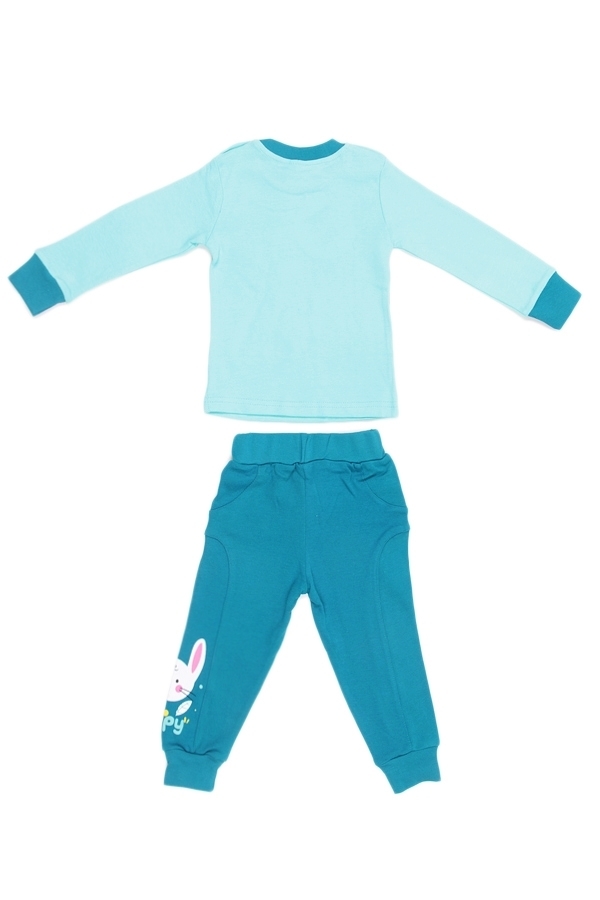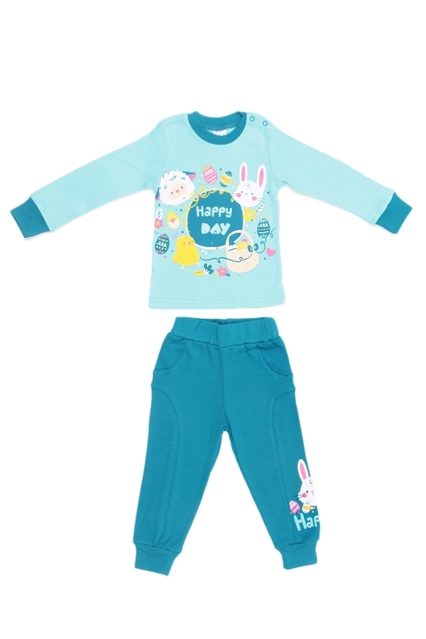 Комплект удобной домашней одежды для девочки. Состоит из джемпера с длинными рукавами на манжетах и брюк свободного кроя, с поясом-резинкой, стандартной высокой посадкой и манжетами на щиколотках. У д... Показать описаниежемпера прямой крой и округлый вырез горловины. На плече есть две кнопки-застежки. Цвет джемпера мятный, горловина и манжеты зеленые. Спереди есть большой рисунок, на котором изображен зайчик, ягненок, цыпленок и надпись Happy day» в окружении цветов и ленточек. Цвет штанов зеленый, внизу на левой штанине изображен такой же зайчик, как на джемпере. Материал комплекта 100% хлопок. Материал: 100% хлопок. Больше картинок и таблица размеров на странице.