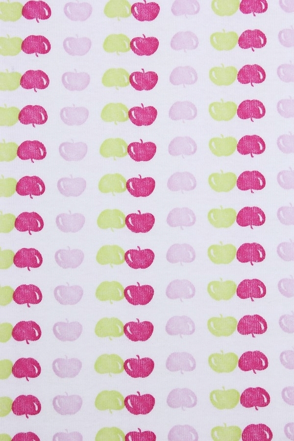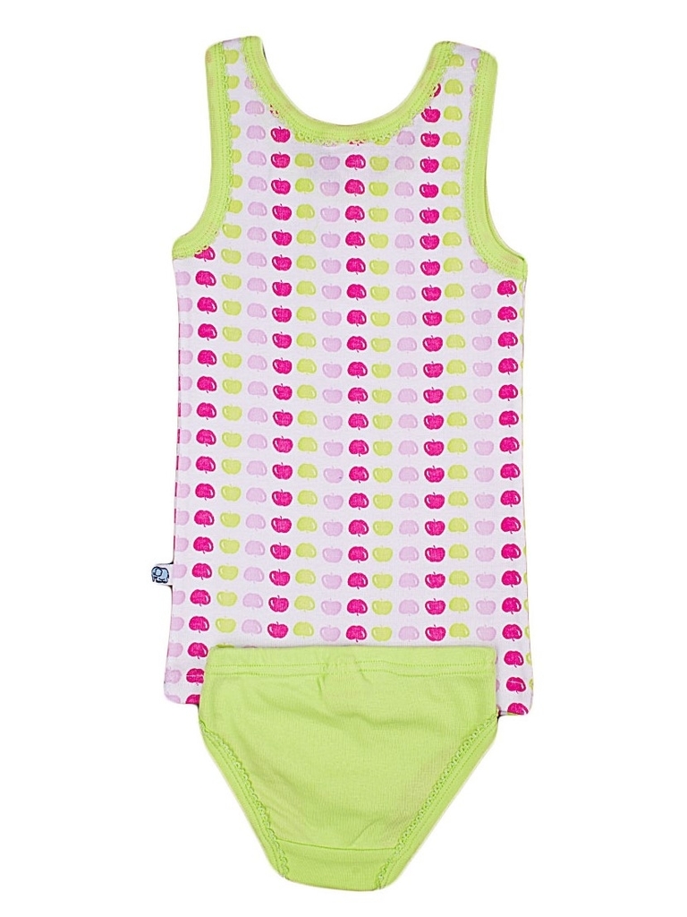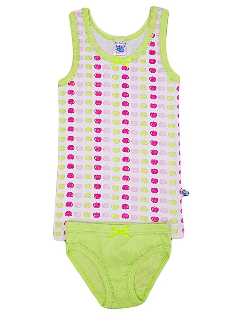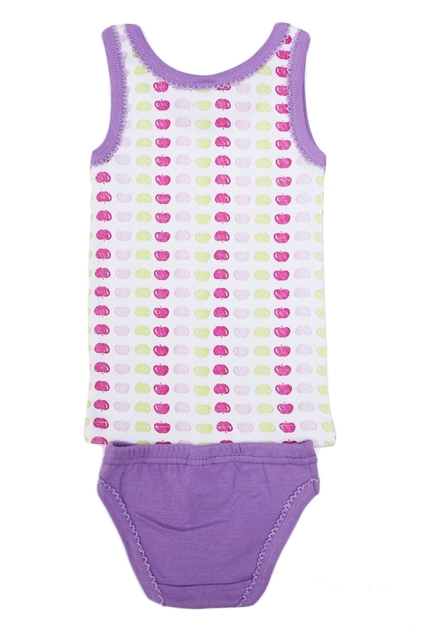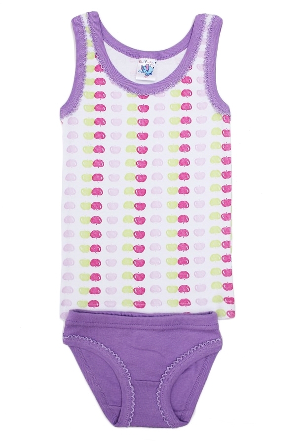Комплект х/б белья для девочки, состоящий из майки и трусиков. Майка: прямой крой, округлая горловина средней глубины, широкие бретели, длина изделия до середины бедра. Трусы: классические плавки на р... Показать описаниеезинке. Цвет комплекта белый/фиолетовый. Майка декорирована принтом в виде мелких разноцветных яблок. Трусики- фиолетовые однотонные. Материал: 100% хлопок. Больше картинок и таблица размеров на странице.