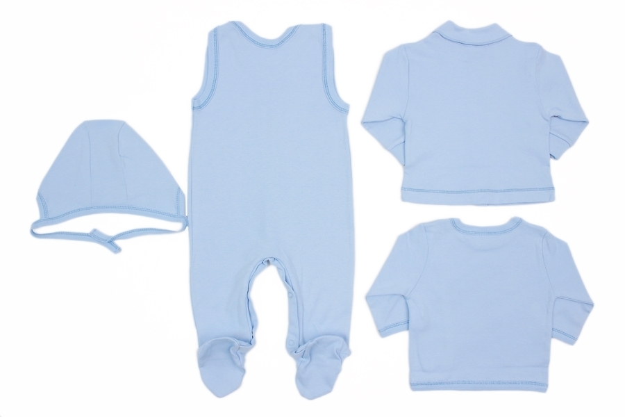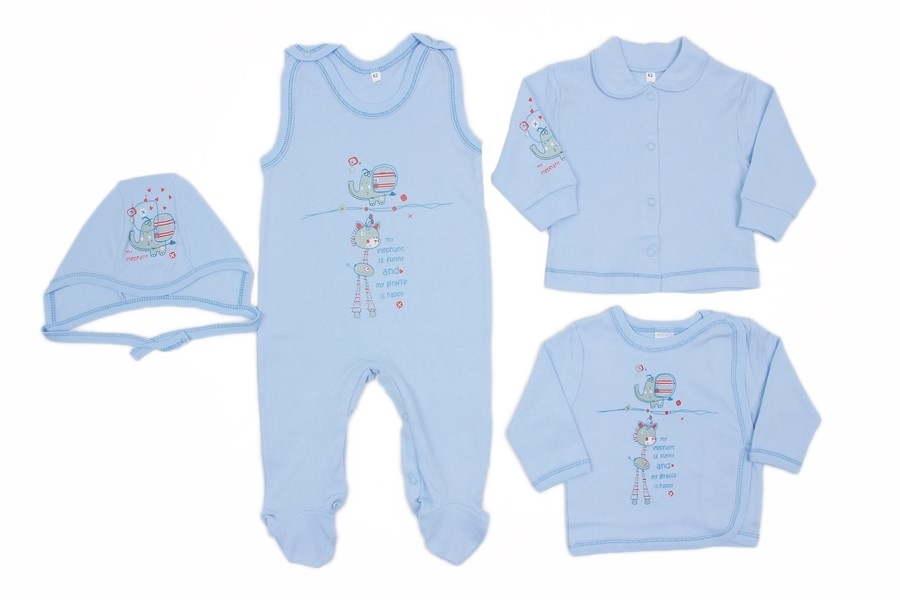 Нежный и мягкий детский комплект. Состоит из 4 предметов: полукомбенизон, кофточка, распашонка и чепчик. Материал 100% процентный качественный хлопок. Цвет-голубой, на предметах одежды есть принт. Отл... Показать описаниеичный комплект белья, может стать хорошим подарком новорожденному крохе. Материал: 100% хлопок. Больше картинок и таблица размеров на странице.