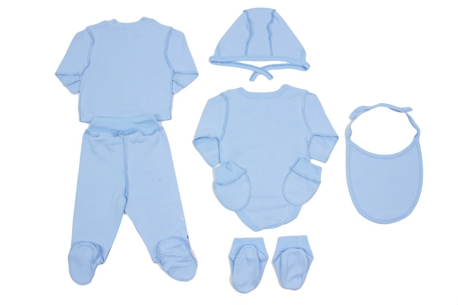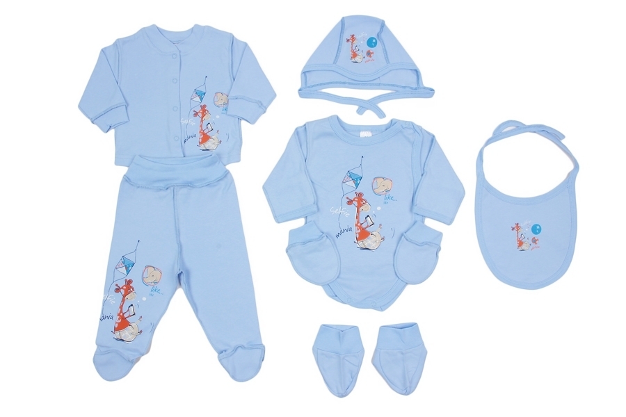 Повседневный детский комплект, содержащий все самое необходимое для малыша. В него входят: кофточка, ползунки, боди, пинетки, царапки, чепчик и слюнявчик. У всех предметов классический крой, все швы н... Показать описаниеаружные. На кофточке и боди спереди есть кнопки-застежки. Цвет комплекта голубой. На всех предметах, кроме царапок и пинеток, есть рисунок изображение жирафа с воздушным змеем. Материал 100% хлопок, синтетика в составе ткани отсутствует. Материал: 100% хлопок. Больше картинок и таблица размеров на странице.