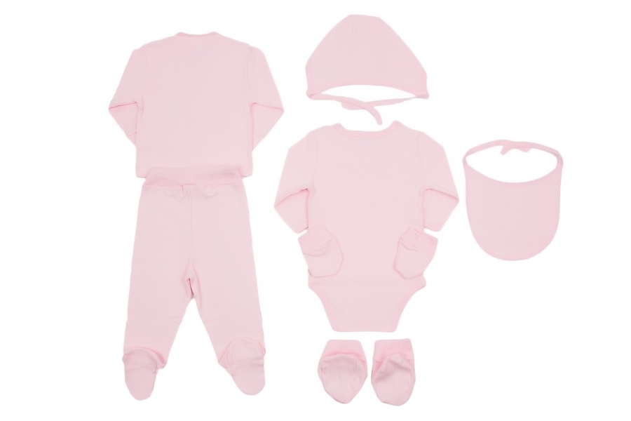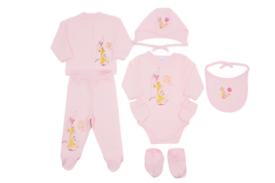 Повседневный детский комплект, содержащий все самое необходимое для малыша. В него входят: кофточка, ползунки, боди, пинетки, царапки, чепчик и слюнявчик. У всех предметов классический крой, все швы н... Показать описаниеаружные. На кофточке и боди спереди есть кнопки-застежки. Цвет комплекта розовый. На всех предметах, кроме царапок и пинеток, есть рисунок изображение жирафа с воздушным змеем. Материал 100% хлопок, синтетика в составе ткани отсутствует. Материал: 100% хлопок. Больше картинок и таблица размеров на странице.