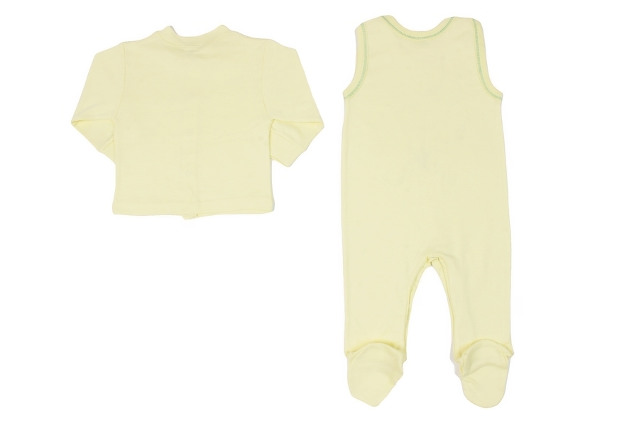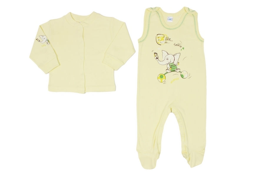Детский комплет: ползунки и кофточка. Цвет-желтый. На ползунках есть принт в виде слоненка с мячами. Кофточка свободного кроя, рукава снебольшими манжетами. На рукаве принт (слоник) Выполнен комплект ... Показать описаниеиз нежного, качественного хлопка. Материал: 100% хлопок. Больше картинок и таблица размеров на странице.