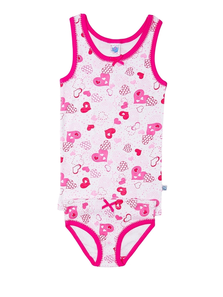 Комплект хлопкового нижнего белья для девочки, состоящий из длинной прямой майки и трусиков классического кроя. Цвет комплекта белый с изображениями розовых и красных сердечек разных размеров. Вырез г... Показать описаниеорловины, проймы на майке, а также прорезь для ног на трусиках отделаны розовой бейкой. Также на горловине и поясе-резинке есть небольшие бантики из розовой ленты. Материал 100% хлопок, благодаря чему этот комплект может стать частью комфортного повседневного гардероба. Материал: 100% хлопок. Больше картинок и таблица размеров на странице.