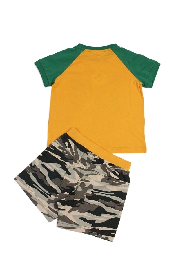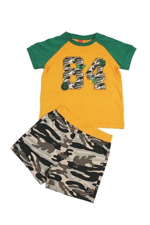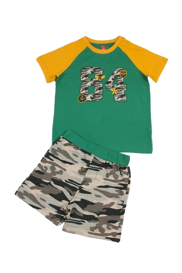 Комплект из натурального хлопка для мальчика. В составе комплекта- футболка и шорты. Футболка ярко желтого цвета с зеленой горловиной и рукавами. Отделана принтом в виде цифр расцветки комуфляж. Округ... Показать описаниелый вырез горловины. Шорты оформлены в цвете комуфляж с жедтой окантовкой на поясе. Отличный, комфортный комплект на жаркую погоду и для повседневной носки. Материал: 100% хлопок. Больше картинок и таблица размеров на странице.