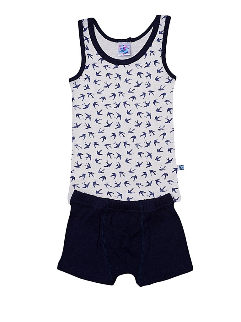 Комплект для мальчика, состоящий из классической майки и трусиков-боксеров. Майка: прямой крой, глубокий вырез горловины. Цвет белый, вырез горловины и пройма отделаны темно-синей бейкой. Майка украше... Показать описаниена принтом с изображением ласточек (по всему изделию). Трусики: облегающие тело боксеры на резинке, цвет чёрный, без рисунков и надписей. Материал 100% хлопок. Удобный, не сковывающий движений вариант на каждый день. Материал: 100% хлопок. Больше картинок и таблица размеров на странице.