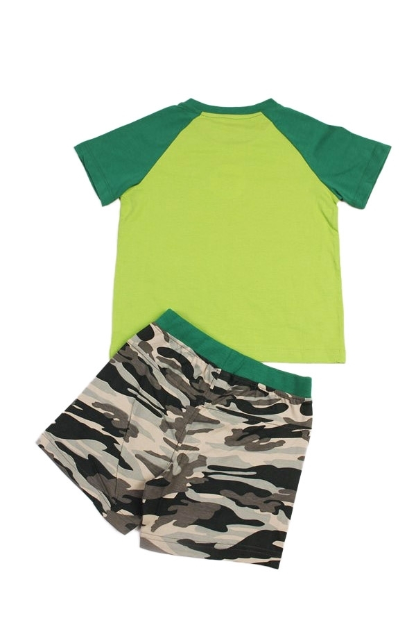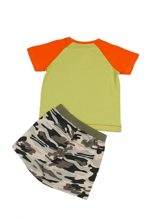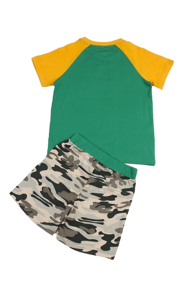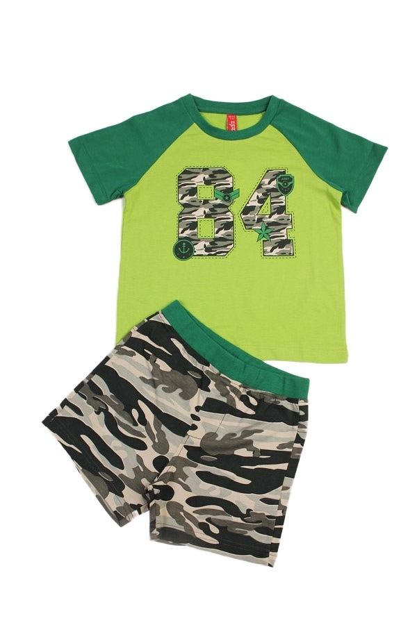 Комплект из натурального хлопка для мальчика. В составе комплекта- футболка и шорты. Футболка ярко салатового цвета с зелеными горловиной и рукавами. Отделана принтом в виде цифр расцветки комуфляж. Ш... Показать описаниеорты оформлены в цвете комуфляж с зеленой окантовкой на поясе. Отличный, комфортный комплект на жаркую погоду и для повседневной носки. Материал: 100% хлопок. Больше картинок и таблица размеров на странице.