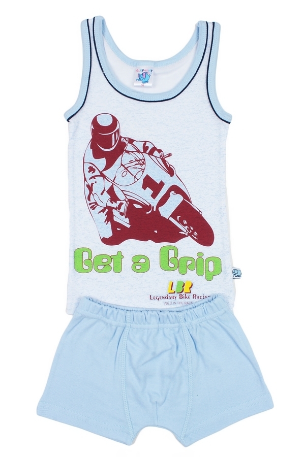 Комплект для мальчика, состоящий из классической майки и трусиков-боксеров. Майка: прямой крой, глубокий вырез горловины. Цвет светло-голубой, вырез горловины и пройма отделаны голубой бейкой и темно-... Показать описаниесиним декоративным элементом. Майка украшена принтом изображение гонщика на мотоцикле и яркими надписями. Трусики: облегающие тело боксеры на резинке, цвет голубой, без рисунков и надписей. Материал 100% хлопок. Удобный, не сковывающий движений вариант на каждый день. Материал: 100% хлопок. Больше картинок и таблица размеров на странице.