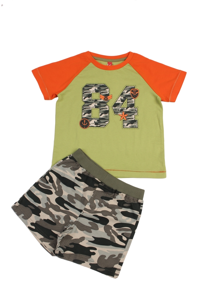 Комплект из натурального хлопка для мальчика. В составе комплекта- футболка и шорты. Футболка зеленого цвета, с оранжвыми горловиной и рукавами. Отделана принтом в виде цифр расцветки комуфляж. Шорты ... Показать описаниеоформлены в цвете комуфляж с зеленой окантовкой на поясе. Отличный, комфортный комплект на жаркую погоду и для повседневной носки. Материал: 100% хлопок. Больше картинок и таблица размеров на странице.