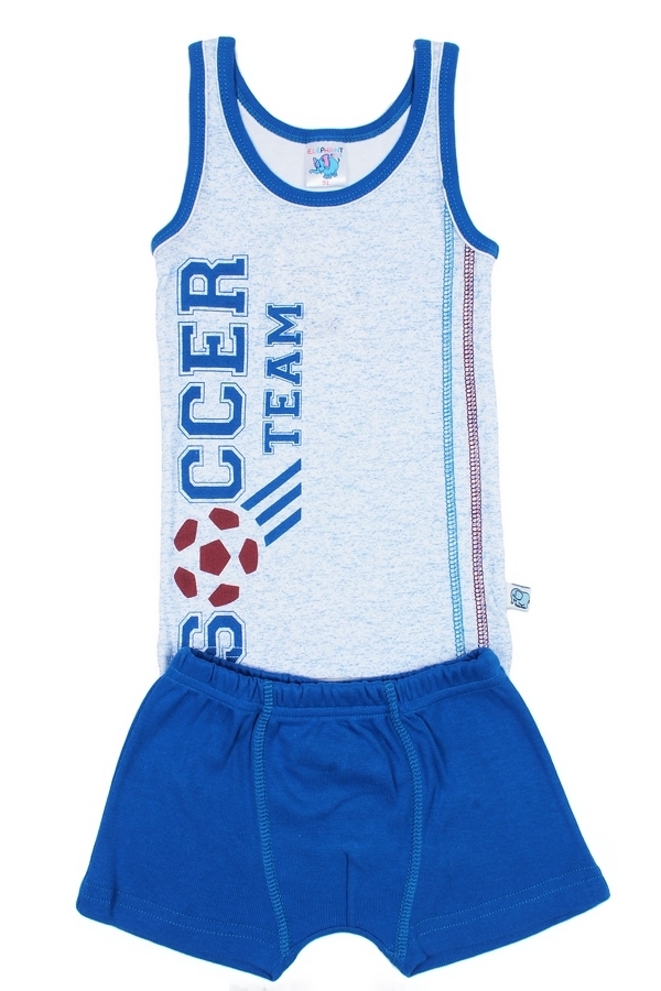 Комплект спортивного белья для мальчика, состоящий из майки и трусов-боксеров. Материал 100% хлопок. Майка: классическая модель прямого кроя с широкими бретелями и глубоким вырезом горловины. Цвет сер... Показать описаниеый, горловина и проймы отделаны синей бейкой. Спереди слева по всей высоте майки есть две вертикальные полосы темно-голубого и бордового цвета, справа большая вертикальная надпись SOCCER TEAM» с бордовым футбольным мячом вместо буквы О». Трусы: короткие боксеры со средней посадкой и поясом-резинкой. Цвет синий. Рисунки и надписи отсутствуют. Материал: 100% хлопок. Больше картинок и таблица размеров на странице.