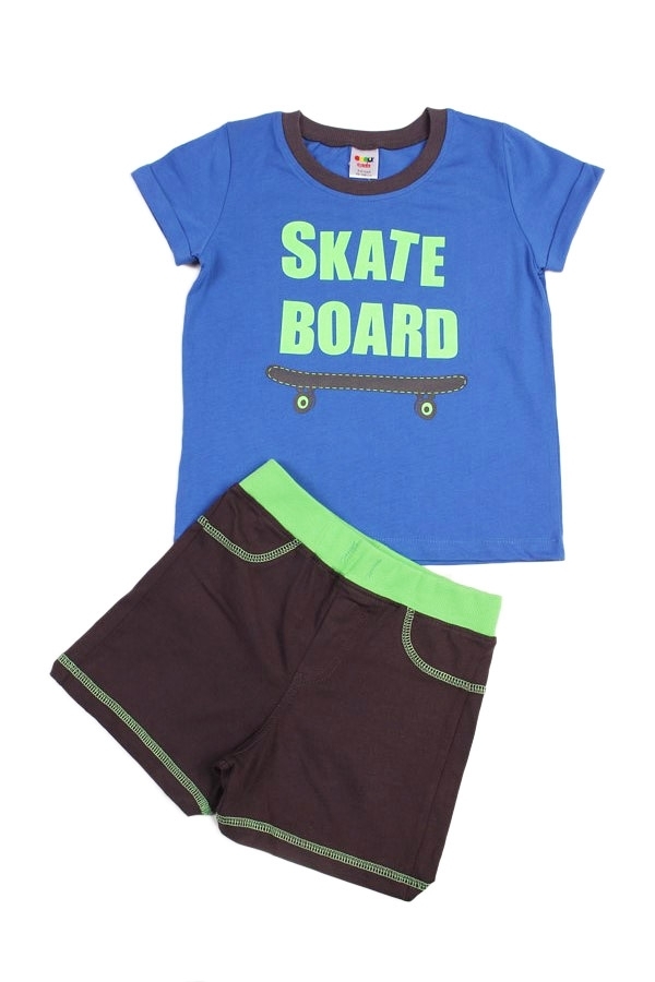 Комплект из натурального хлопка для мальчика. В составе комплекта- футболка и шорты. Футболка ярко синего цвета с зеленым принтом в виде английских букв и скейта. Округлый вырез горловины с коричневой... Показать описание окантовкой. Шорты оформлены в коричневом цвете с зеленой окантовкой на поясе, карманах и снизу шортиков. Отличный, комфортный комплект на жаркую погоду и для повседневной носки. Материал: 100% хлопок. Больше картинок и таблица размеров на странице.