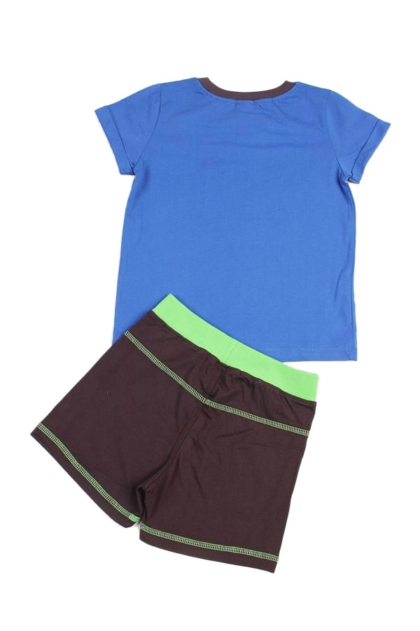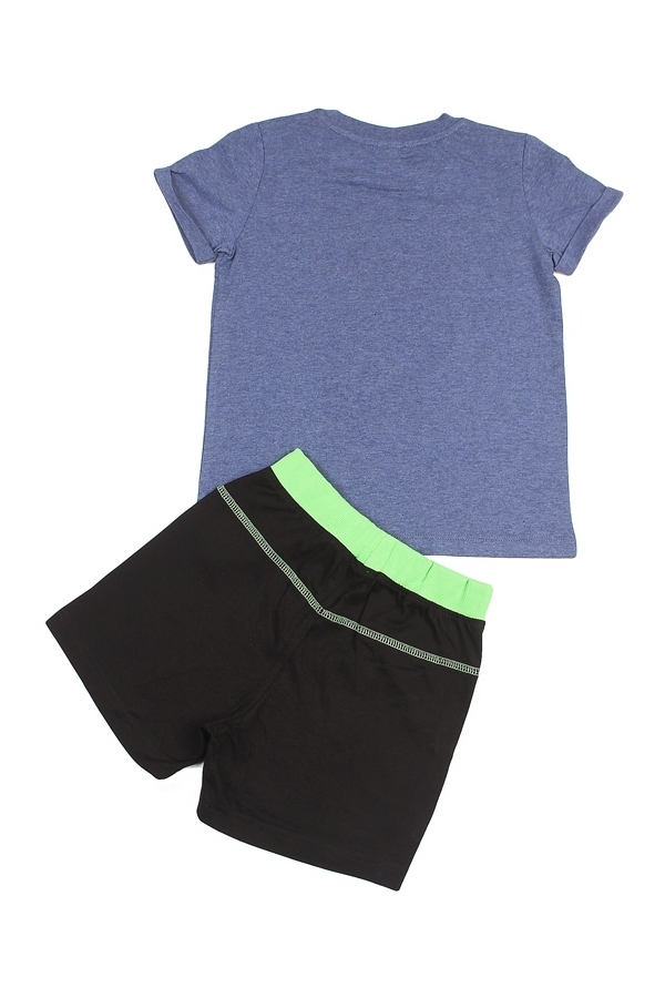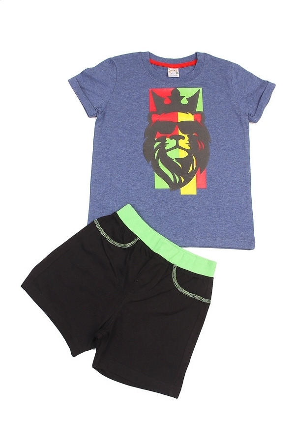 Комплект из натурального хлопка для мальчика. В составе комплекта- футболка и шорты. Футболка синего цвета. Отделана принтом. Округлый вырез горловины. Шорты черного цвета с зеленым оформлением на поя... Показать описаниесе и карманах. Отличный, комфортный комплект на жаркую погоду и для повседневной носки. Материал: 100% хлопок. Больше картинок и таблица размеров на странице.