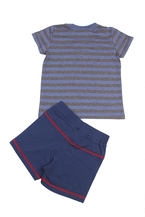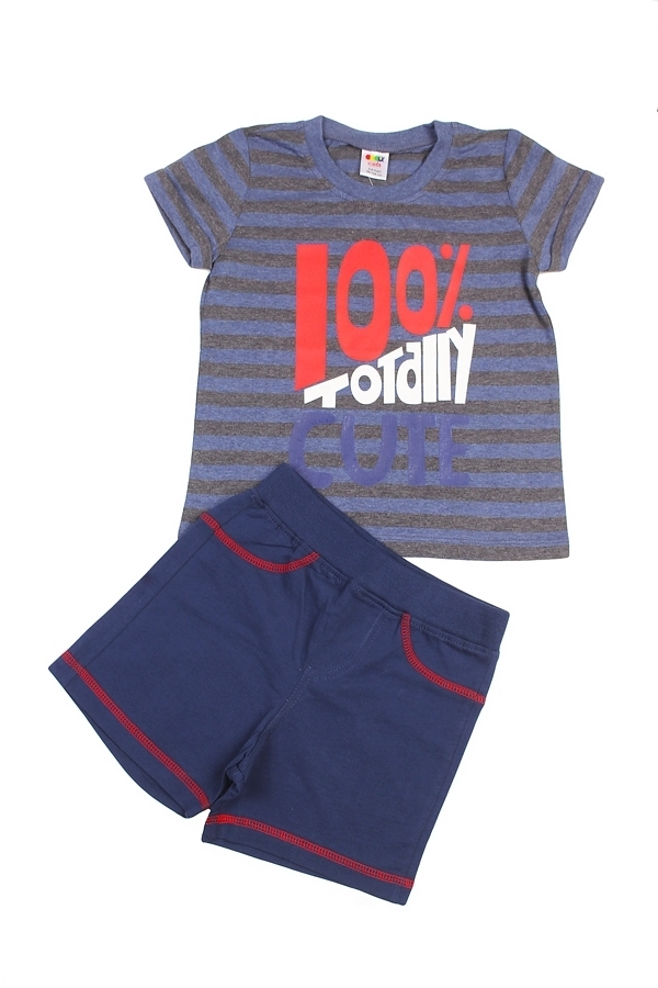 Комплект из натурального хлопка для мальчика. В составе комплекта- футболка и шорты. Футболка синего цвета в полоску. Отделана принтом. Округлый вырез горловины. Шорты темно/синего цвета с красной ока... Показать описаниентовкой. Отличный, комфортный комплект на жаркую погоду и для повседневной носки. Материал: 100% хлопок. Больше картинок и таблица размеров на странице.