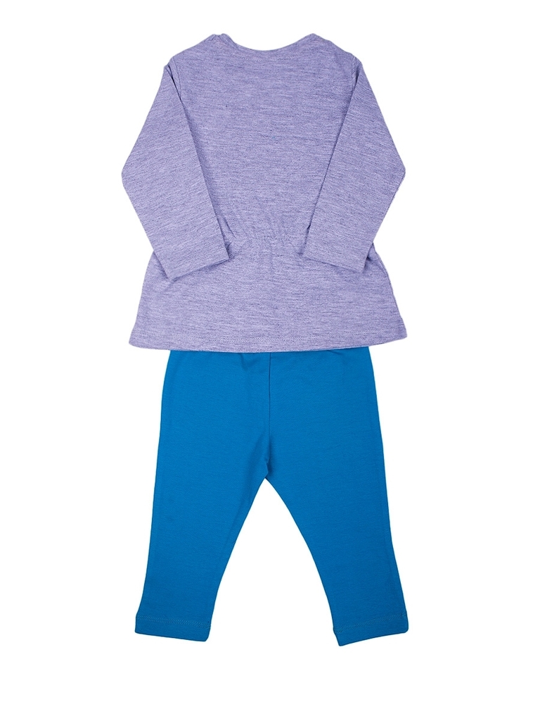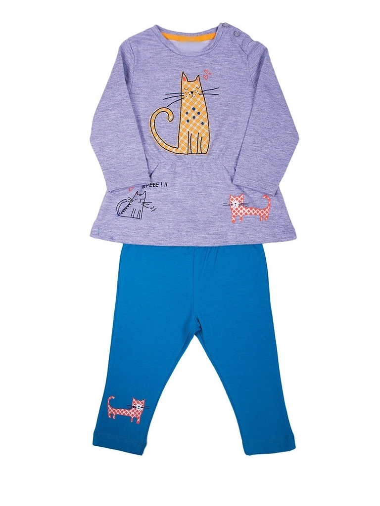 Комплект для девочки, состоящий из платья и леггинцев. Платье-трапеция для девочки-модницы. Длинные, слегка зауженные рукава, неглубокий округлый вырез горловины. Длина платья выше колена. На плече за... Показать описаниестежки на пуговицах. Цвет серый меланж, на груди и снизу по бокам украшено принтом в виде кошечек. Леггенцы - высокая посадка, пояс-резинка, облегающий фигуру крой. Длина до середины голени. Материал хлопок. Цвет синий. Внизу на левой штанины есть декор в виде кошечки. Отличный вариант для детского сада и других повседневных выходов. Материал: 100% хлопок. Больше картинок и таблица размеров на странице.