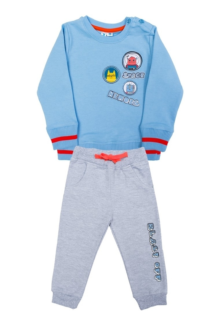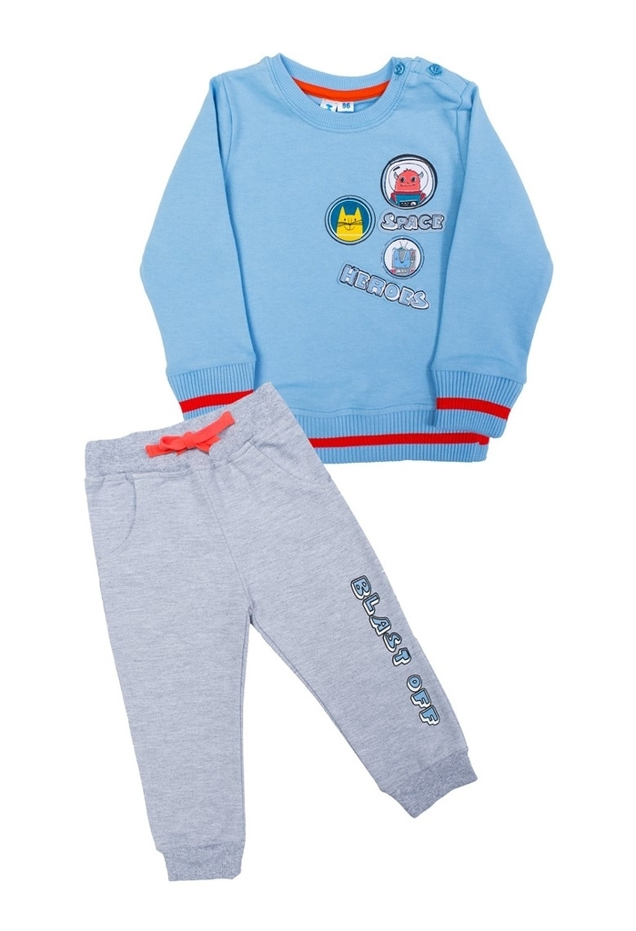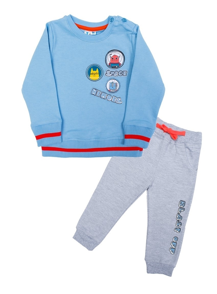 Комплект для мальчика, состоящий из толстовки и брюк спортивного кроя. Толстовка: цвет голубой, прямой крой, длинный рукав, округлый вырез горловины, на рукавах и в низу изделия есть манжеты с отделко... Показать описанией в виде красной полоски, на левом плече есть застежка на двух пуговицах, которая облегчает процесс надевания толстовки. На груди толстовка украшена принтом с изображением космических героев. Брюки: цвет серый меланж, на широком поясе с завязкой оранжевого цвета, с низу штанин есть манжеты в цвет изделия, по бокам два внутренних кармана. На левой штанине брюки украшены принтом в виде надписи BLAST OFF». Такой комплект наверняка станет одной из любимых вещей в гардеробе мальчика и будет носиться им с удовольствием. Материал: 100% хлопок. Больше картинок и таблица размеров на странице.