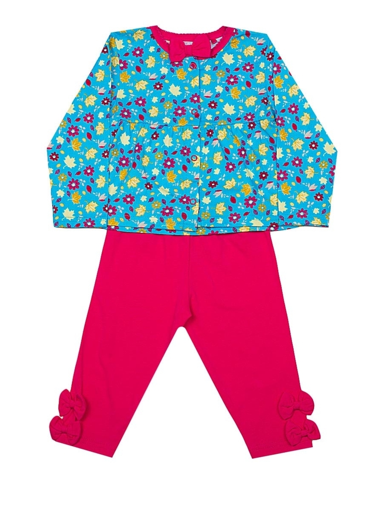 Красивый и удобный летний наряд для маленькой девочки. Комплект состоит из короткого, расклешенного внизу платья и капри. Платье: цвет голубой, с растительным рисунком. Вырез горловины у платья округл... Показать описаниеый, с фигурной отделкой и бантиком розового цвета. Рукава длинные, прямые. Застежка кнопки (4 шт). Капри: цвет розовый, без рисунков и надписей. Пояс резинка, оформление по два бантика розового цвета на каждой ноге. Материал хлопок с небольшим добавлением эластана. Удобный вариант для прогулок, дома и детского сада Материал: 92% хлопок, 8% эластан. Больше картинок и таблица размеров на странице.