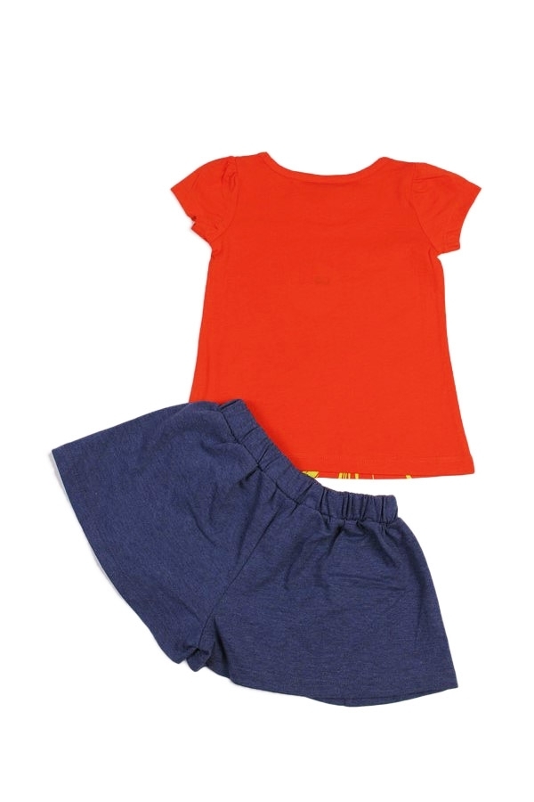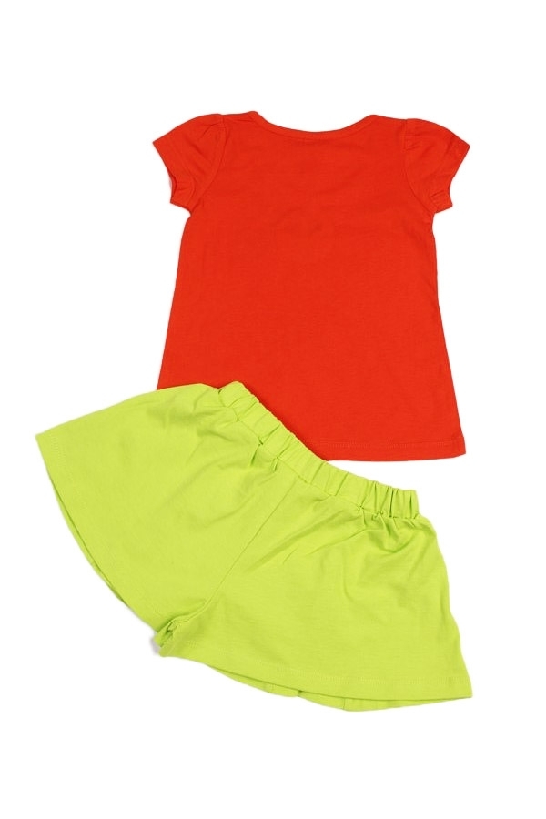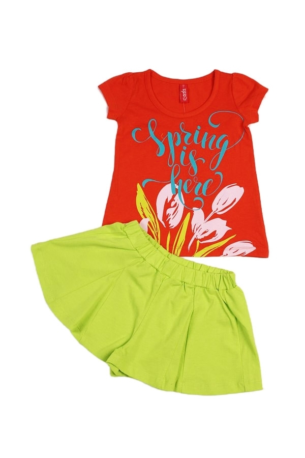 Красивый и стильный летний наряд для маленькой принцессы. Комплект состоит из футболки оранжевого цвета, с ярким прнтом и однотонных, салатовых шортиков (форма клеш). Пояс резинка. Материал 100% хлопо... Показать описаниек. Удобный вариант для прогулок, дома и детского сада. Материал: 100% хлопок. Больше картинок и таблица размеров на странице.